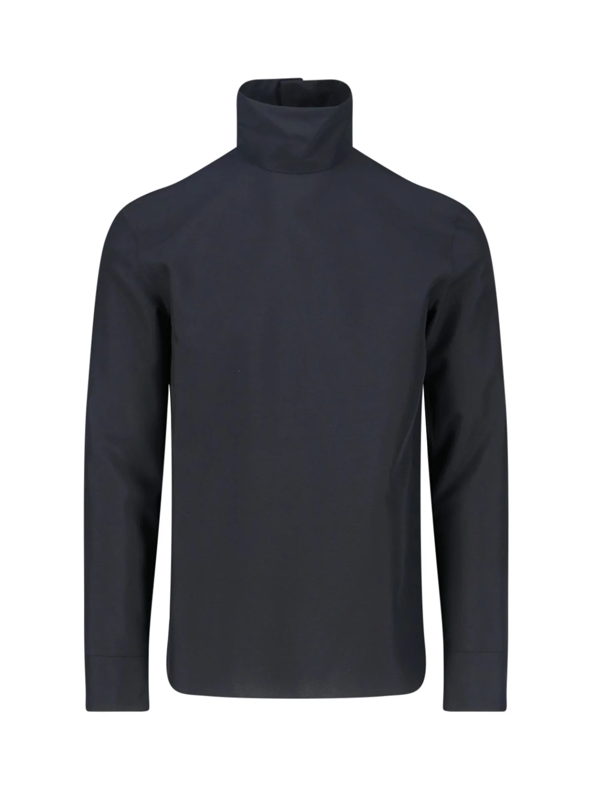 GUCCI TECHNICAL SHIRT IN BLACK FABRIC WITH HIGH NECK, BACK BUTTON CLOSURE, LONG SLEEVES, BUTTON CUFFS, SIDE SLITS AT THE HEM, STRAIGHT HEM. PRODUCT INFO PRODUCT CODE 850332 ZAFKB1000 COMPOSITION: 100% POLYESTER SIZE AND FIT: REGULAR FIT MADE IN: ITALY