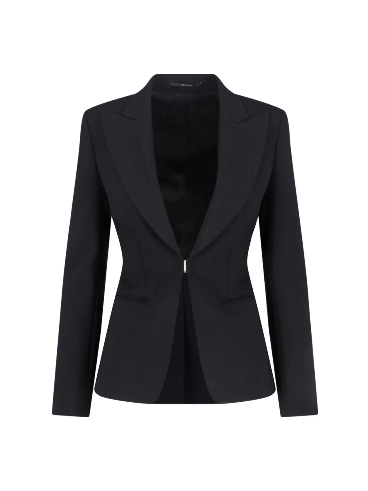 GUCCI BLACK STRETCH WOOL BLAZER WITH PEAK LAPELS, GROSGRAIN HOOK CLOSURE, GG LINING, TWO FRONT WELT POCKETS, CENTRAL BACK SPLIT, AND STRAIGHT HEM. PRODUCT INFO PRODUCT CODE 864253 ZAUPG1000 COMPOSITION: 93% WOOL, 4% ELASTANE, 3% POLYAMIDE SIZE AND FIT: SLIM FIT MADE IN: ITALY