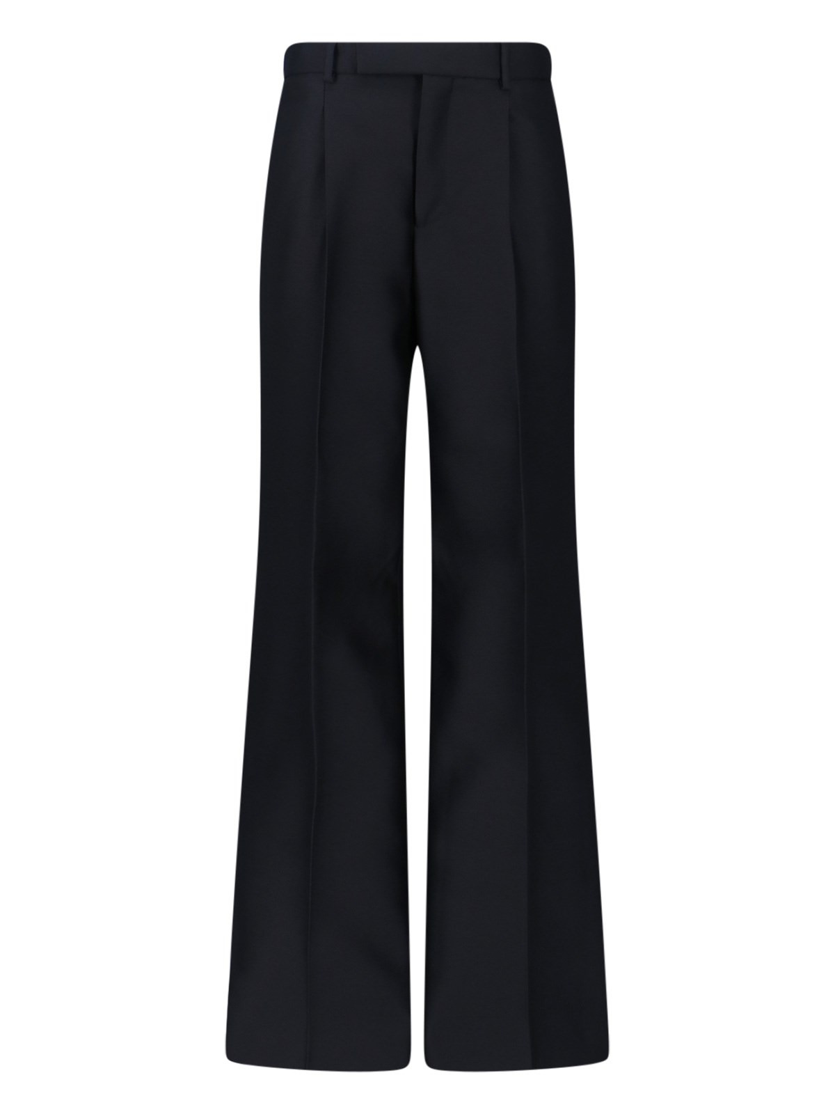 GUCCI BLACK WOOL AND SILK PANTS WITH HIGH WAIST, BELT LOOPS, HOOK AND ZIP CLOSURE, FRONT PIN TUCKS, TWO SIDE POCKETS, TONE-ON-TONE EMBOSSED LOGO ON THE BACK, TWO FLAT BACK POCKETS, STRAIGHT LEG. PRODUCT INFO PRODUCT CODE 827840 Z7AE71000 COMPOSITION: 84% WOOL, 15% SILK SIZE AND FIT: REGULAR FIT MADE IN: ITALY