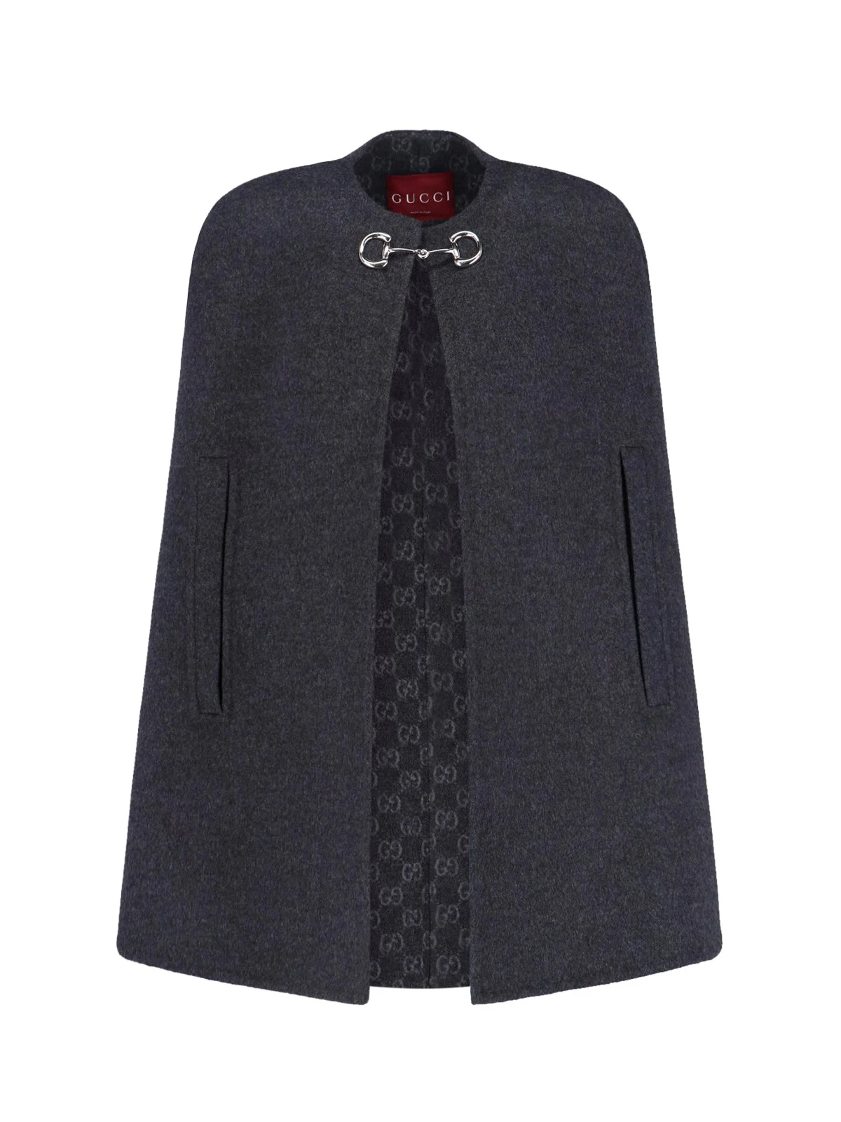 GUCCI BLACK WOOL CAPE WITH CREW NECK, SILVER METAL 'HORSEBIT' CLAMP CLOSURE ON THE FRONT, TWO VERTICAL FRONT POCKETS, GG SUPREME LINING, STRAIGHT HEM. PRODUCT INFO PRODUCT CODE 852796 ZAQW01179 COMPOSITION: 100% WOOL SIZE AND FIT: REGULAR FIT MADE IN: ITALY