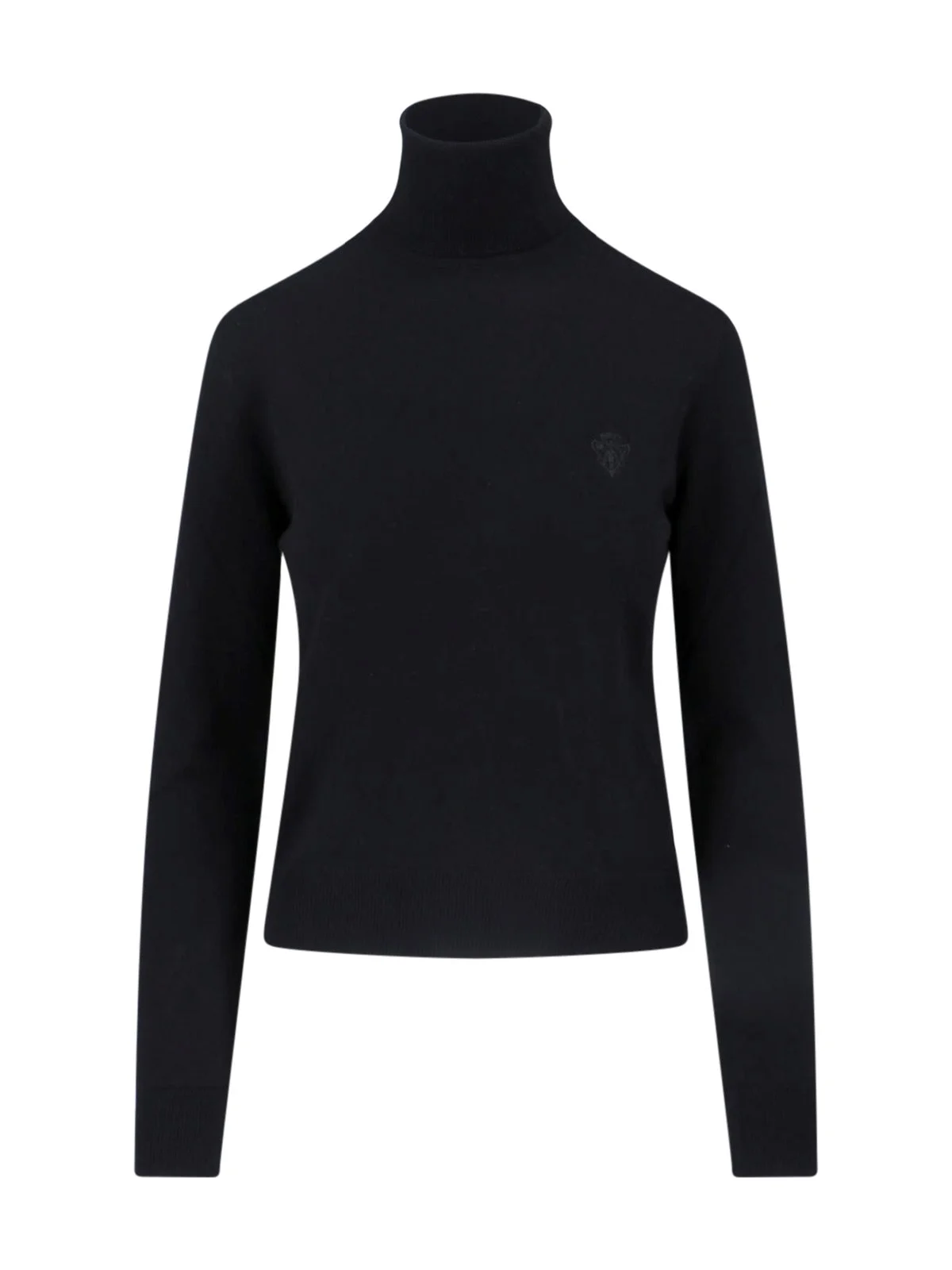 GUCCI BLACK WOOL SWEATER WITH HIGH NECK, LONG SLEEVES, TONAL LOGO EMBROIDERY ON THE FRONT, STRAIGHT HEM. PRODUCT INFO PRODUCT CODE 860442 XKFG71043 COMPOSITION: 100% WOOL SIZE AND FIT: REGULAR FIT MADE IN: ITALY