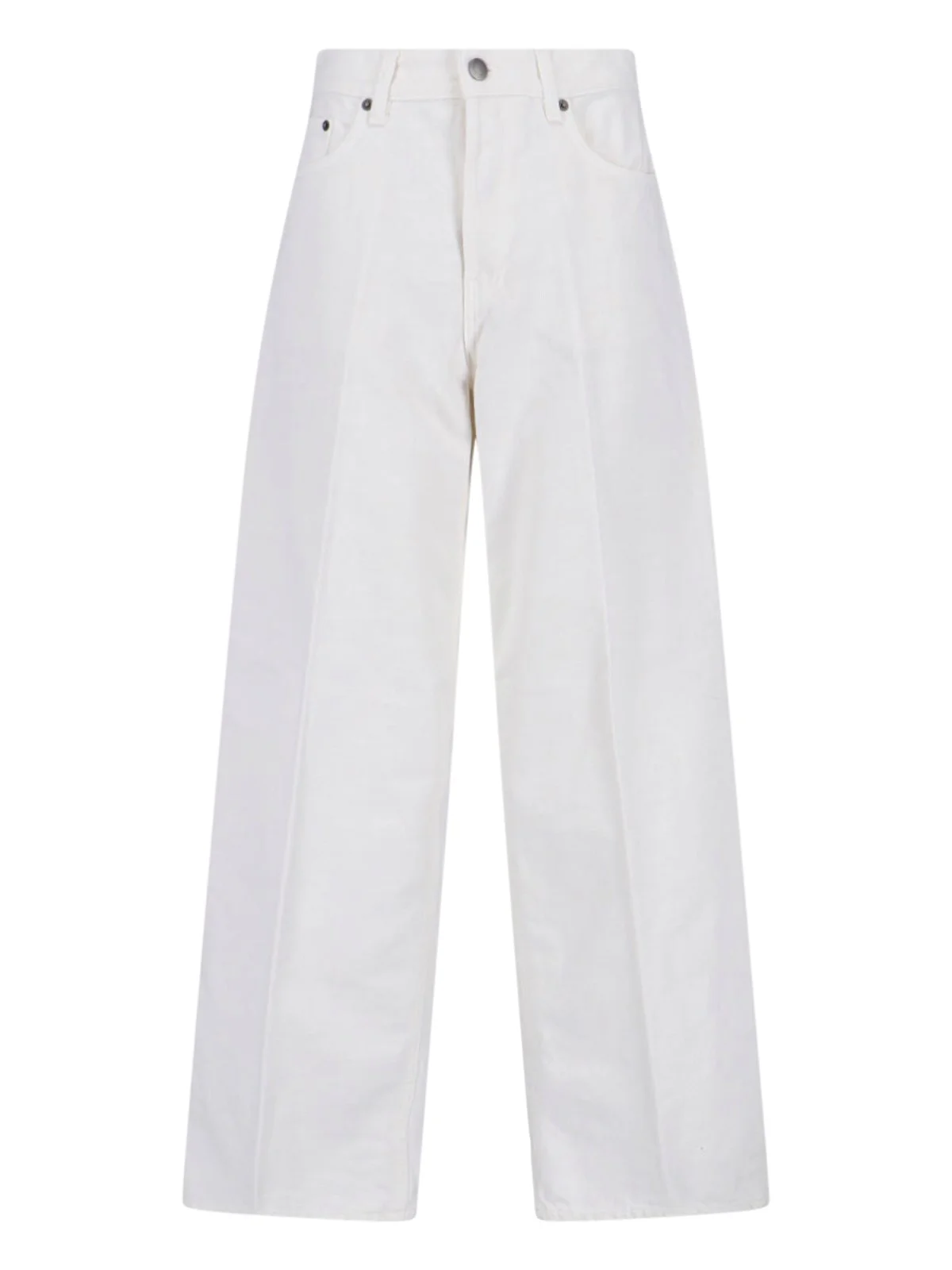 HAIKURE WIDE BETHANY BULL 44 JEANS IN WHITE COTTON DENIM WITH MEDIUM WAIST, FRONT BUTTON CLOSURE, FIVE POCKETS, LOGO PATCH ON THE BACK, AND WIDE LEG. PRODUCT INFO PRODUCT CODE HEW03296GF172PXT0341 COMPOSITION: 100% COTTON SIZE AND FIT: SOFT FIT MADE IN: ITALY