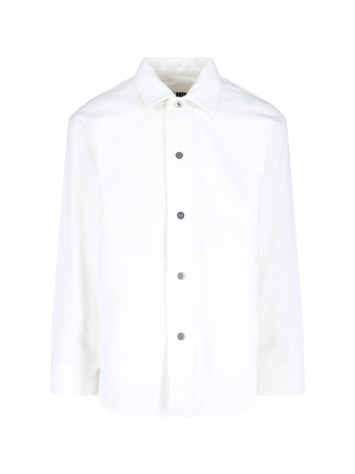 JIL SANDER WHITE DENIM SHIRT JACKET WITH CLASSIC COLLAR, BUTTON CLOSURE, BACK LOGO PATCH, BUTTON CUFFS, CURVED HEM. PRODUCT INFO PRODUCT CODE J23DL0101 J45288102 COMPOSITION: 100% COTTON SIZE AND FIT: REGULAR FIT MADE IN: JAPAN