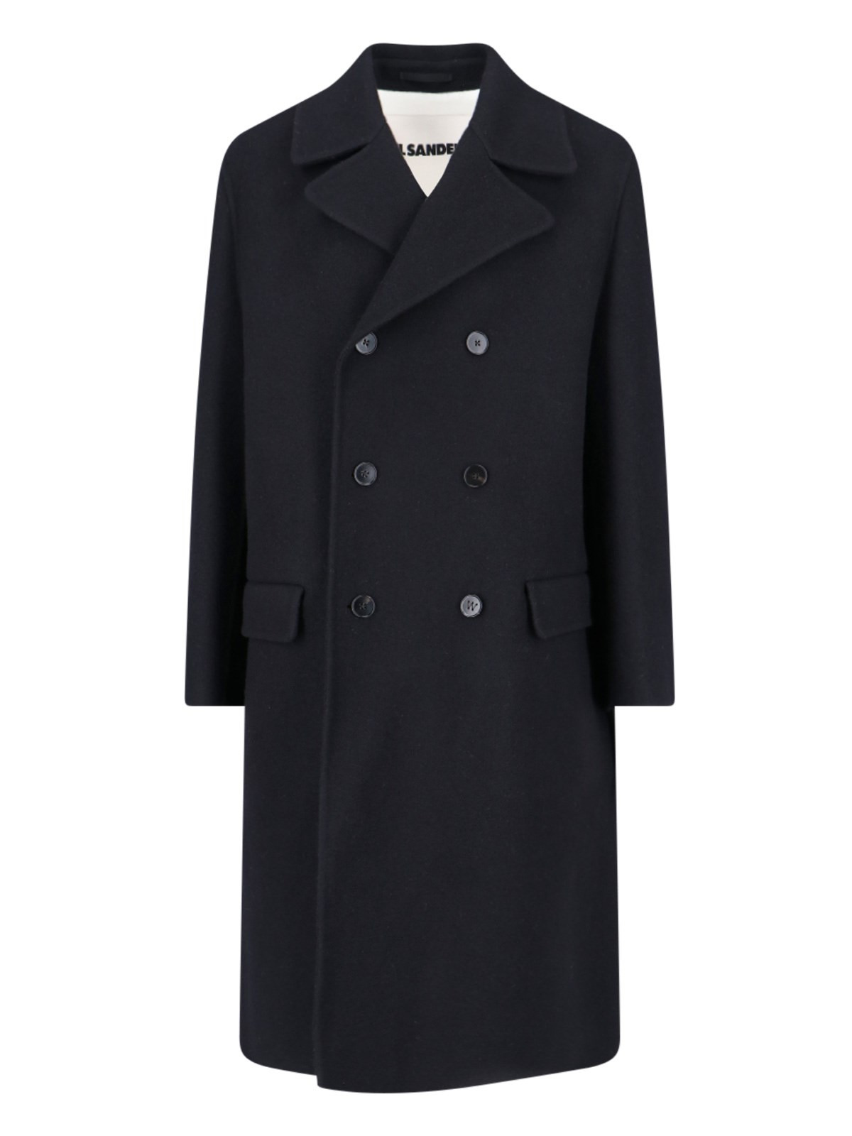 JIL SANDER DOUBLE-BREASTED COAT, BLACK WOOL, CLASSIC LAPELS, FRONT BUTTON CLOSURE, TWO FRONT FLAP POCKETS, CENTER BACK VENT, STRAIGHT HEM. PRODUCT INFO PRODUCT CODE J23AA0003 J40020001 - 100% WOOL - LOOSE FIT MADE IN: ITALY