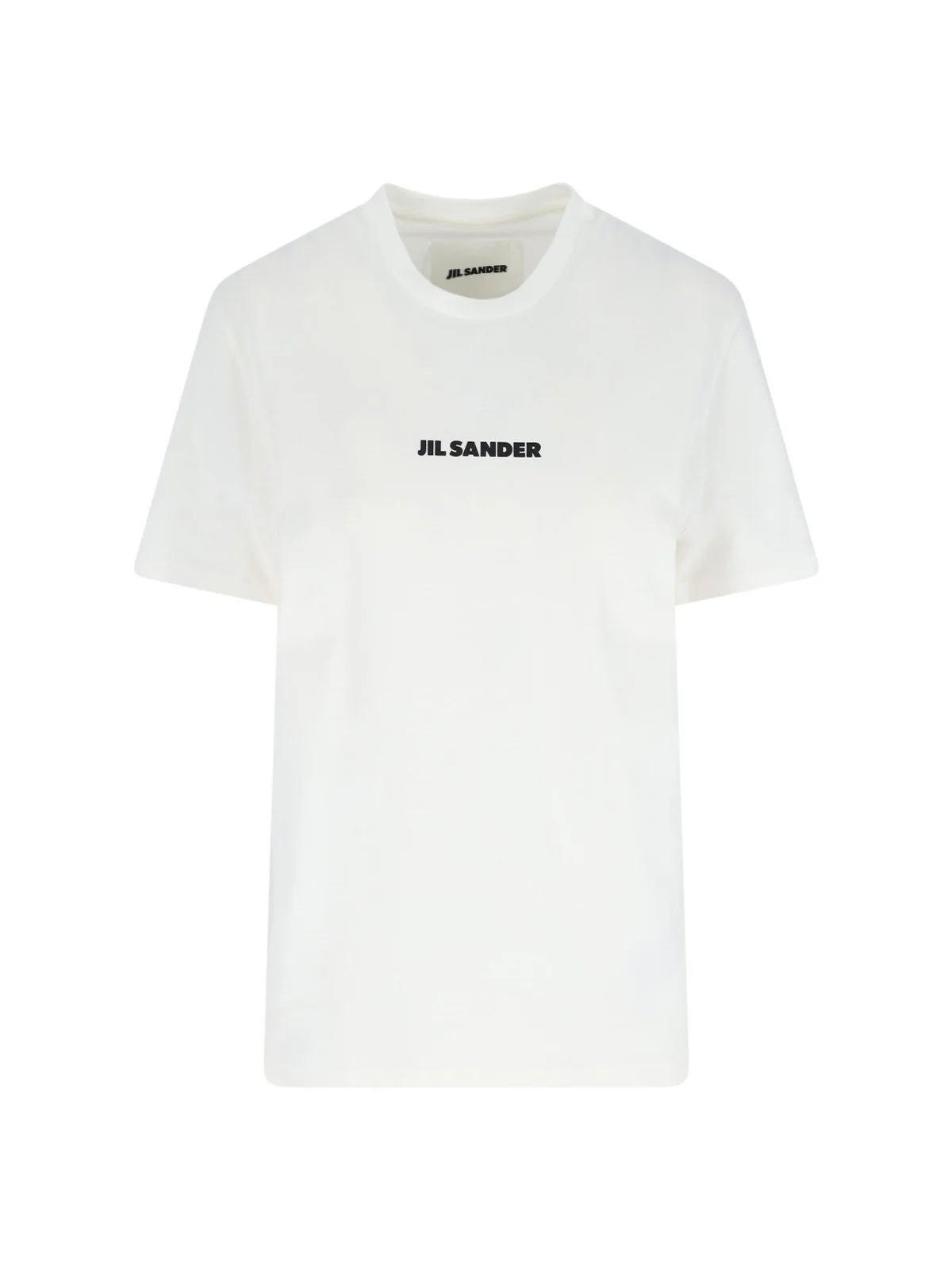 JIL SANDER LOGO T-SHIRT IN WHITE COTTON WITH CREWNECK, SHORT SLEEVES, CONTRASTING LOGO PRINT ON THE FRONT, AND STRAIGHT HEM. PRODUCT INFO PRODUCT CODE J02GC0142 J20103102 COMPOSITION: 100% COTTON SIZE AND FIT: REGULAR FIT MADE IN: ITALY
