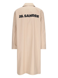 JIL SANDER LOGO TRENCH COAT IN BEIGE COTTON WITH CLASSIC COLLAR, BUTTON CLOSURE, TWO SIDE POCKETS, BLACK LOGO PRINT AT THE BACK, STRAIGHT HEM. PRODUCT INFO PRODUCT CODE J23AA0007 J45026236 COMPOSITION: 100% COTTON SIZE AND FIT: SOFT FIT MADE IN: ITALY