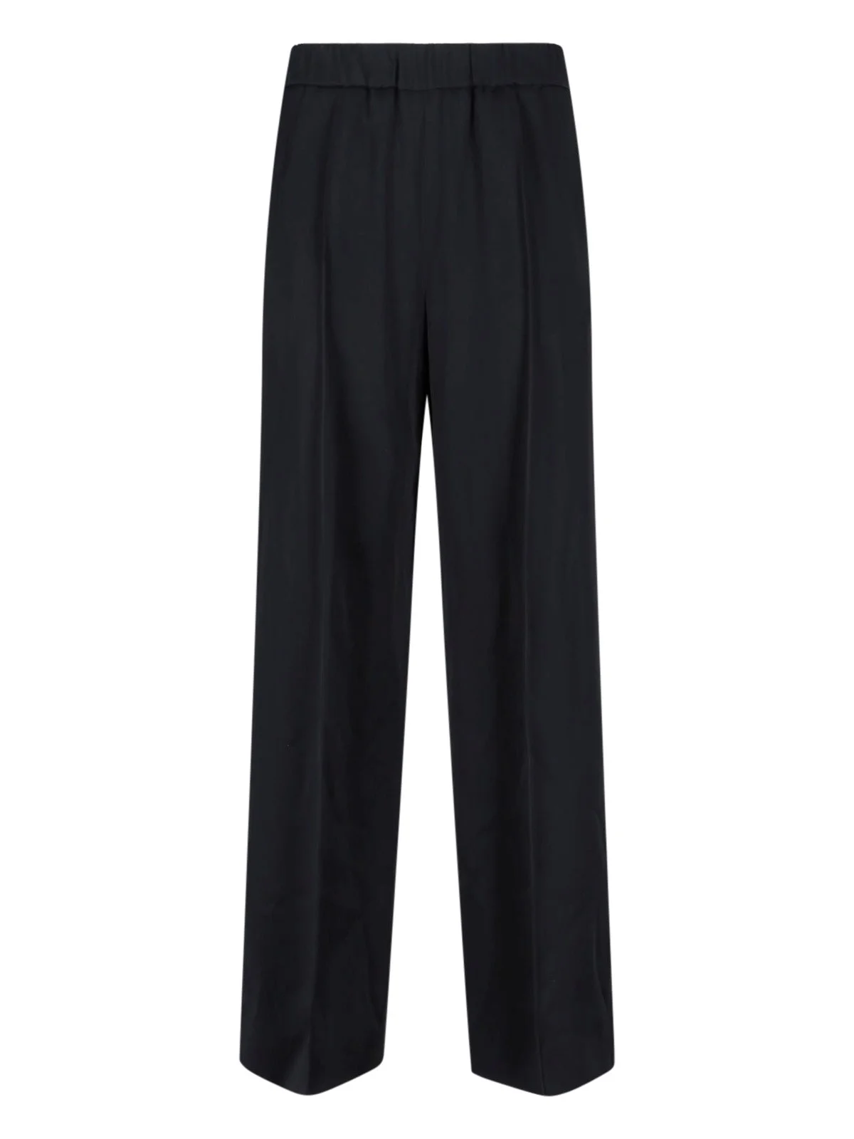 JIL SANDER TAILORED TROUSERS IN BLACK FABRIC WITH MEDIUM ELASTIC WAISTBAND, TWO SLANTED SIDE POCKETS, TWO BACK POCKETS, WIDE LEG. PRODUCT INFO PRODUCT CODE J02KA0180 J76018001 COMPOSITION: 74% ACETATE, 26% VISCOSE SIZE AND FIT: REGULAR FIT MADE IN: ITALY