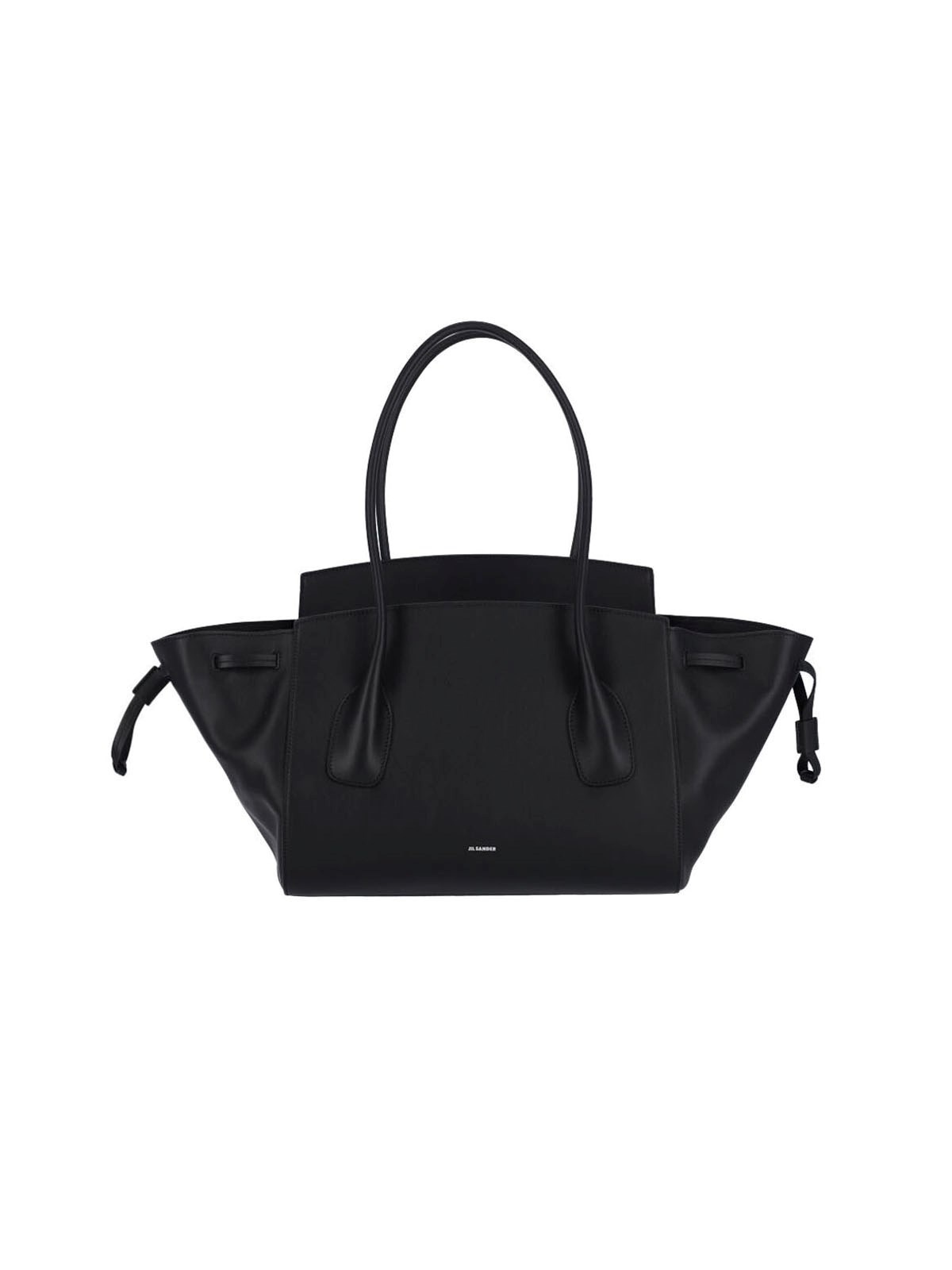 JIL SANDER 'VOYAGE' SMALL BLACK CALF LEATHER BAG WITH TWO TOP HANDLES, MAGNETIC FLAP CLOSURE, LEATHER DRAWSTRING DETAIL, ARGERNTATO LOGO PRINT ON THE FRONT, INNER ZIP POCKET, FLAT POCKET, MAIN INNER COMPARTMENT PRODUCT INFO PRODUCT CODE J08ZH0070 P8374001 COMPOSITION: 100% CALF LEATHER SIZE AND FIT: H 25 X W 42 X D 17 CM MADE IN: ITALY