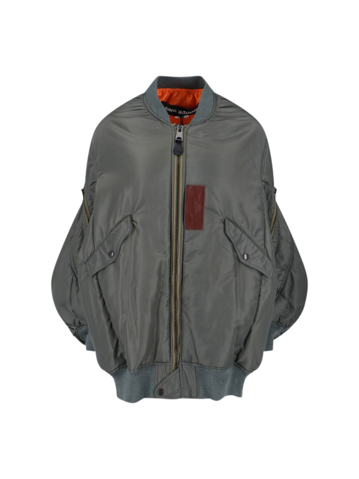JUNYA WATANABE PADDED BOMBER JACKET IN GREEN NYLON WITH RIBBED WOOL COLLAR, ZIP CLOSURE, CURVED SLEEVES, ZIP DETAIL, BROWN SUEDE PATCH ON THE FRONT, TWO FRONT BUTTON FLAP POCKETS, BUTTON ON THE HEM, RIBBED ELASTIC TRIMS, STRAIGHT HEM. PRODUCT INFO PRODUCT CODE JP J012 W251 COMPOSITION: 100% NYLON SIZE AND FIT: OVERSIZED FIT MADE IN: JAPAN - TRIMS: 100% LEATHER