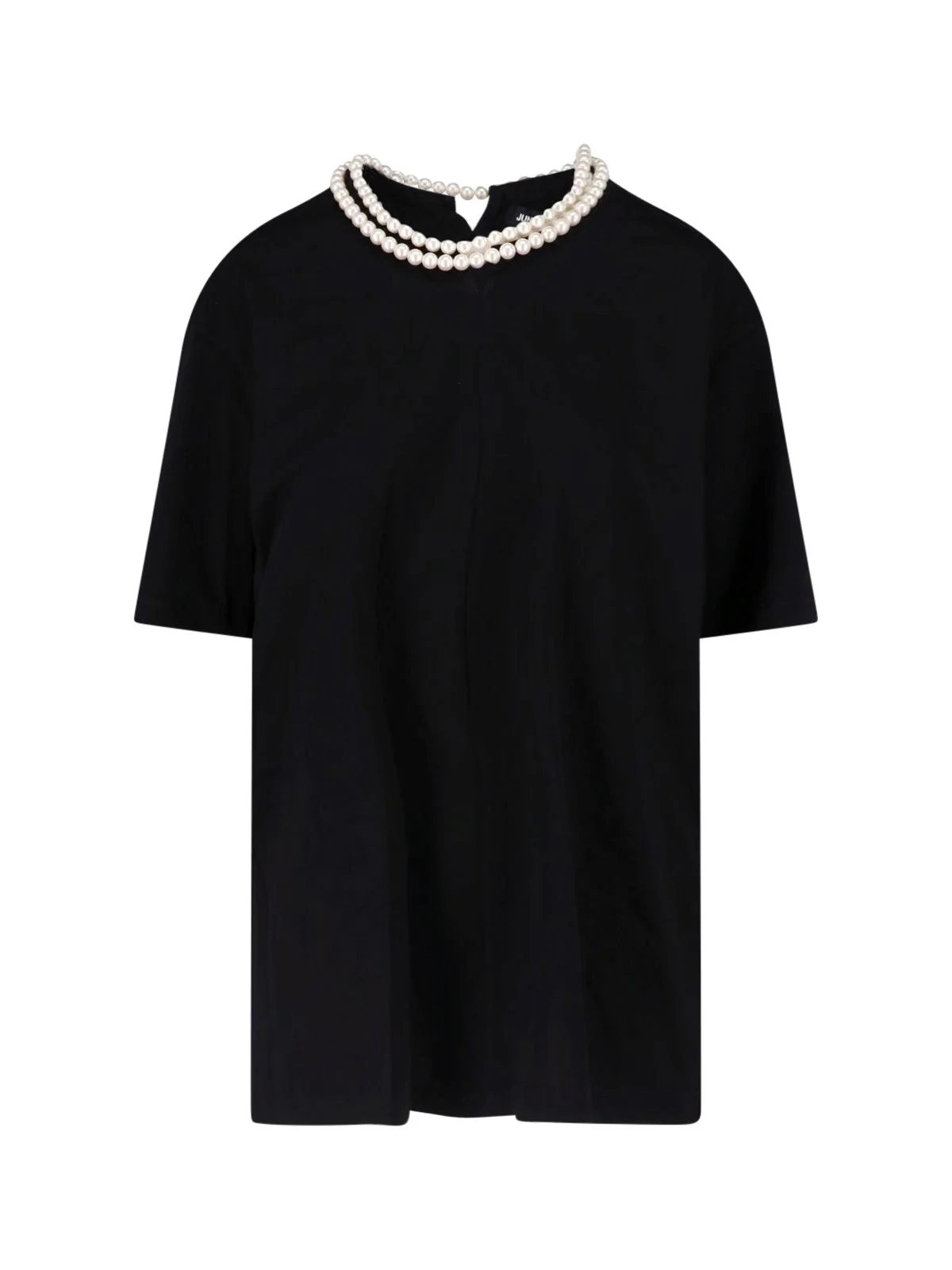 - JUNYA WATANABE PEARL T-SHIRT IN BLACK COTTON - CREW NECK - SHORT SLEEVES - PEARL DETAIL APPLIED ALL-AROUND THE COLLAR PRODUCT INFO PRODUCT CODE JQ T009 S261 COMPOSITION: 100% COTTON SIZE AND FIT: LOOSE FIT MADE IN: JAPAN