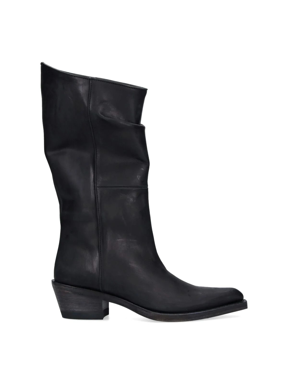 KHAITE 'CLIVE' BLACK CALF LEATHER BOOTS WITH DISTRESSED EFFECT, POINTED TOE, EMBOSSED CICITURE DETAIL, LEATHER SOLE. PRODUCT INFO PRODUCT CODE F1105 945 L945200 COMPOSITION: 100% LEATHER SIZE AND FIT: HEEL HEIGHT 3.5 CM MADE IN: ITALY - SOLE: 100% LEATHER