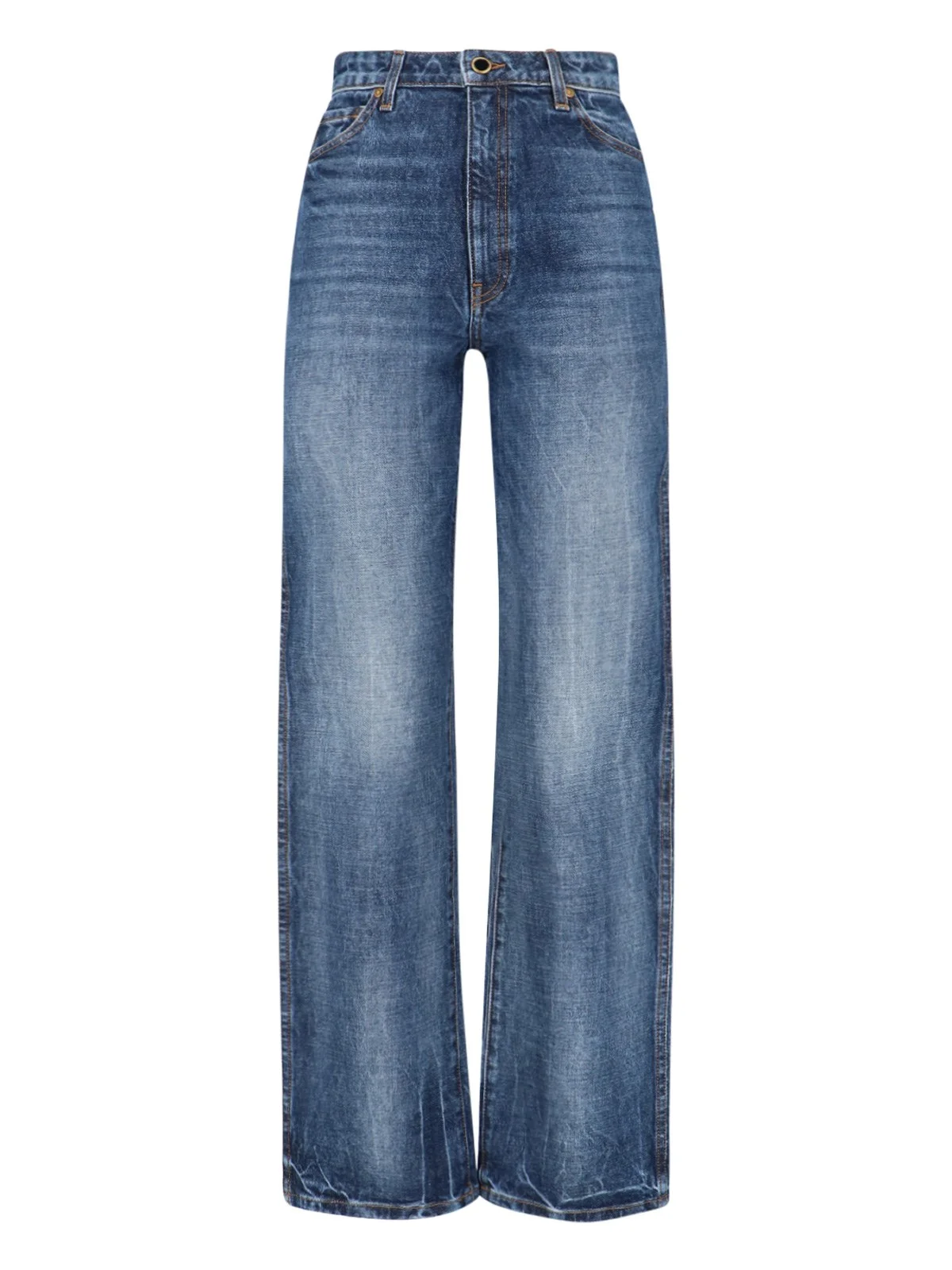 KHAITE BLUE COTTON DENIM DANIELLE JEANS WITH DISTRESSED EFFECT, HIGH WAIST, BUTTON AND BELT CLOSURE, FIVE POCKETS, STRAIGHT LEG. PRODUCT INFO PRODUCT CODE 1032916006 W916006 COMPOSITION: 98% COTTON, 2% ELASTANE SIZE AND FIT: REGULAR FIT MADE IN: USA
