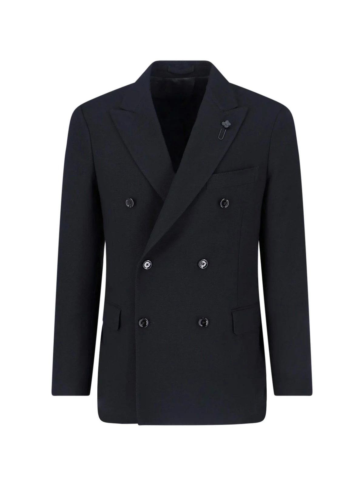 LARDINI DOUBLE-BREASTED BLAZER IN BLACK WOOL WITH LAPELS, DOUBLE-BREASTED BUTTON CLOSURE ON THE FRONT, LONG SLEEVES, ONE FLAT FRONT POCKET, TWO SIDE FLAP POCKETS, BROOCH DETAIL, STRAIGHT HEM. PRODUCT INFO PRODUCT CODE CN520AE PTC445054 COMPOSITION: 100% WOOL SIZE AND FIT: REGULAR FIT MADE IN: ITALY