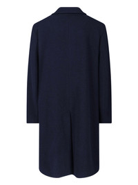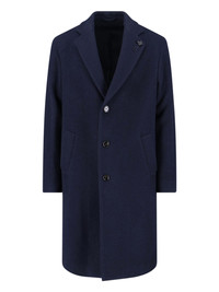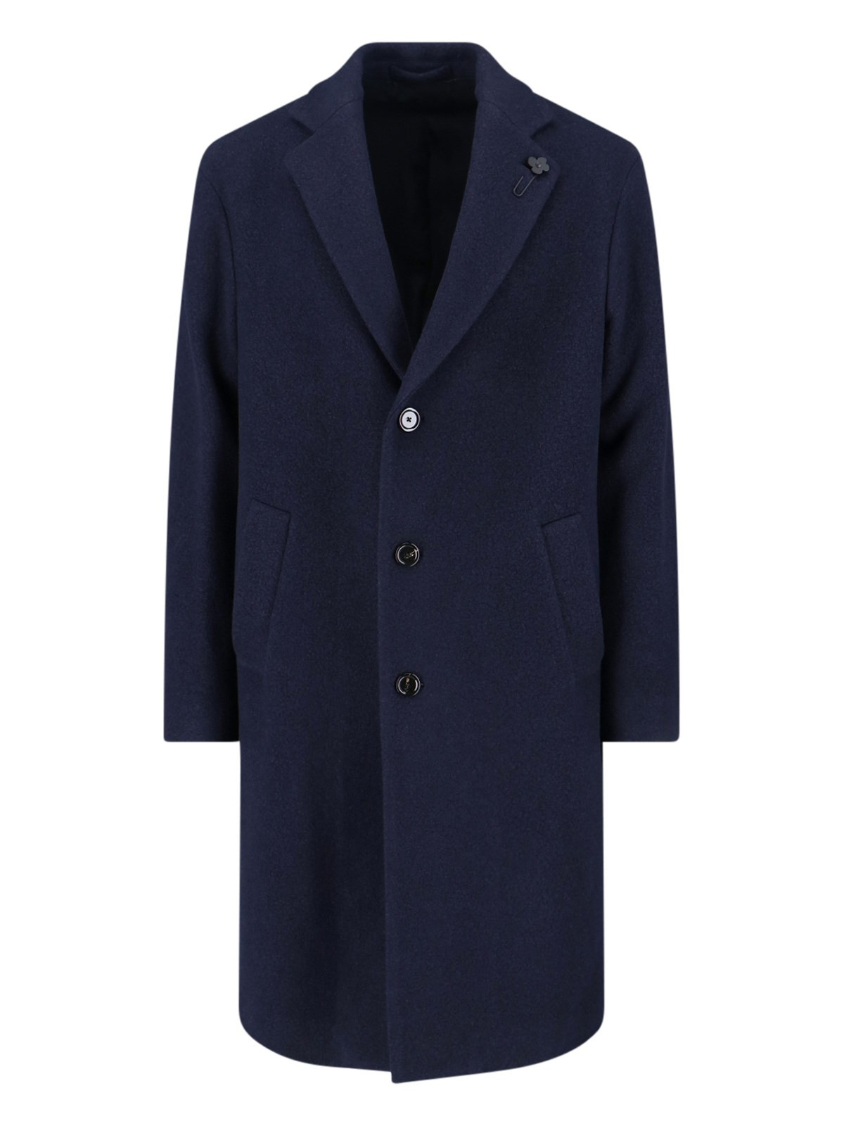 LARDINI SINGLE-BREASTED COAT IN NAVY BLUE VIRGIN WOOL BLEND WITH CLASSIC LAPELS, BUTTON CLOSURE, TWO SIDE FLAT POCKETS, METAL CHARM DETAIL ON THE FRONT, BACK SPLIT, AND STRAIGHT HEM. PRODUCT INFO PRODUCT CODE AA23152 CN65603850NE COMPOSITION: 63% VIRGIN WOOL, 13% SILK, 13% NYLON, 11% CASHMERE SIZE AND FIT: REGULAR FIT MADE IN: ITALY