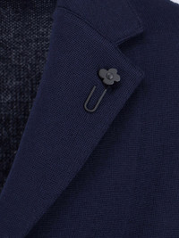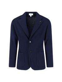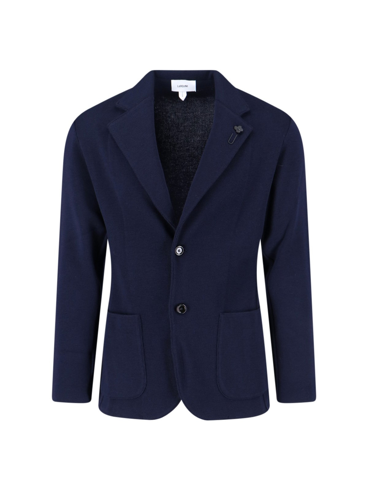 LARDINI SINGLE-BREASTED VIRGIN WOOL BLAZER IN NAVY BLUE KNIT WITH CLASSIC LAPELS, BLACK METAL LOGO DETAIL, BUTTON CLOSURE, TWO SIDE POCKETS, BUTTON CUFFS, STRAIGHT HEM. PRODUCT INFO PRODUCT CODE CNCLJM56 CN65000850 COMPOSITION: 100% VIRGIN WOOL SIZE AND FIT: REGULAR FIT MADE IN: ITALY
