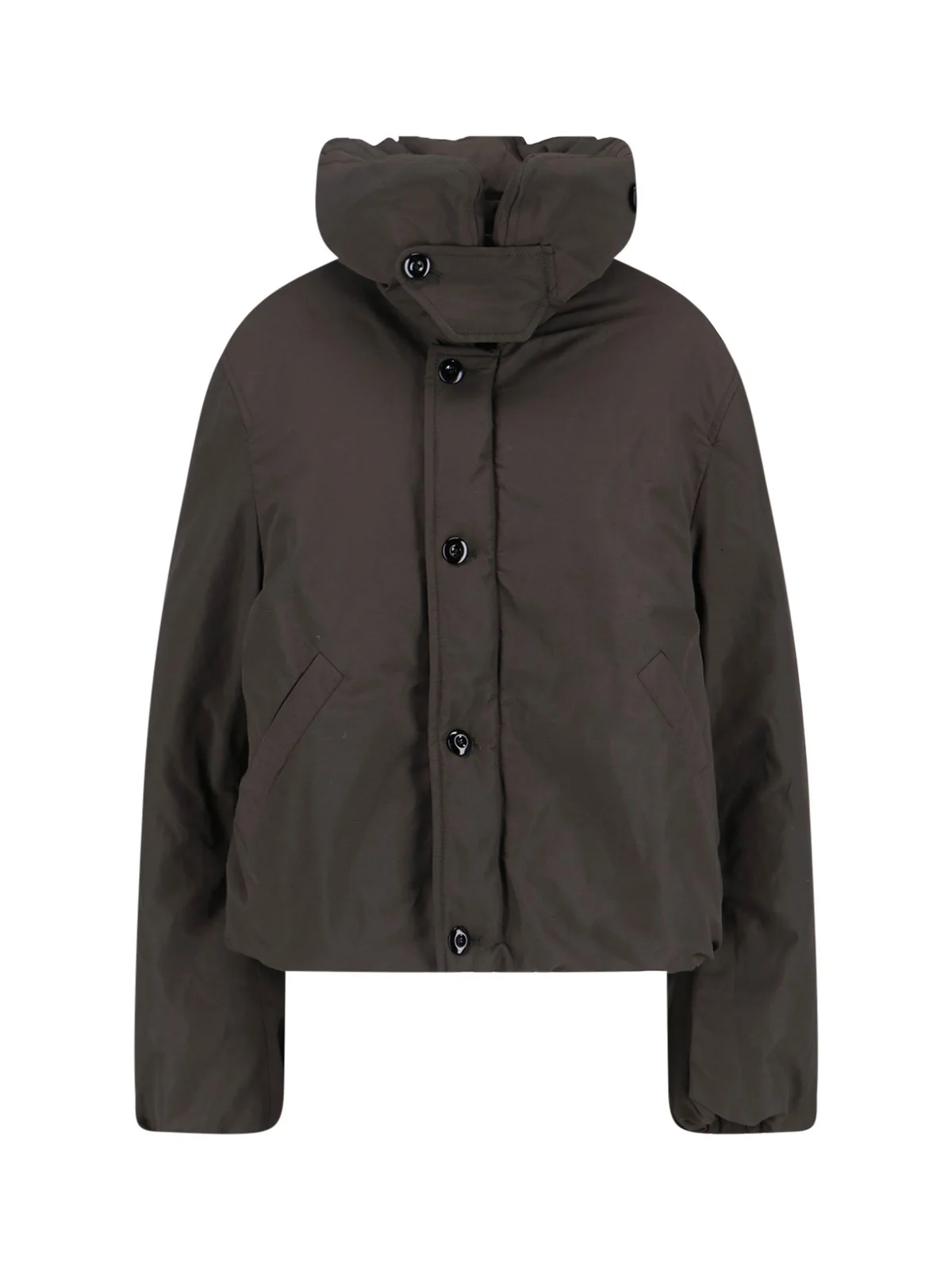 LEMAIRE PADDED DOWN JACKET IN DARK BROWN FABRIC WITH BUTTON AND ZIP CLOSURE, LONG SLEEVES, SIDE POCKETS, SNAP BUTTONS POCKETS, ADJUSTABLE DRAWSTRING AT THE HEM, STRAIGHT HEM. PRODUCT INFO PRODUCT CODE OW1151 LF1019BR507 COMPOSITION: 44% POLYAMIDE, 32% LINEN, 24% COTTON SIZE AND FIT: REGULAR FIT MADE IN: TUNISIA