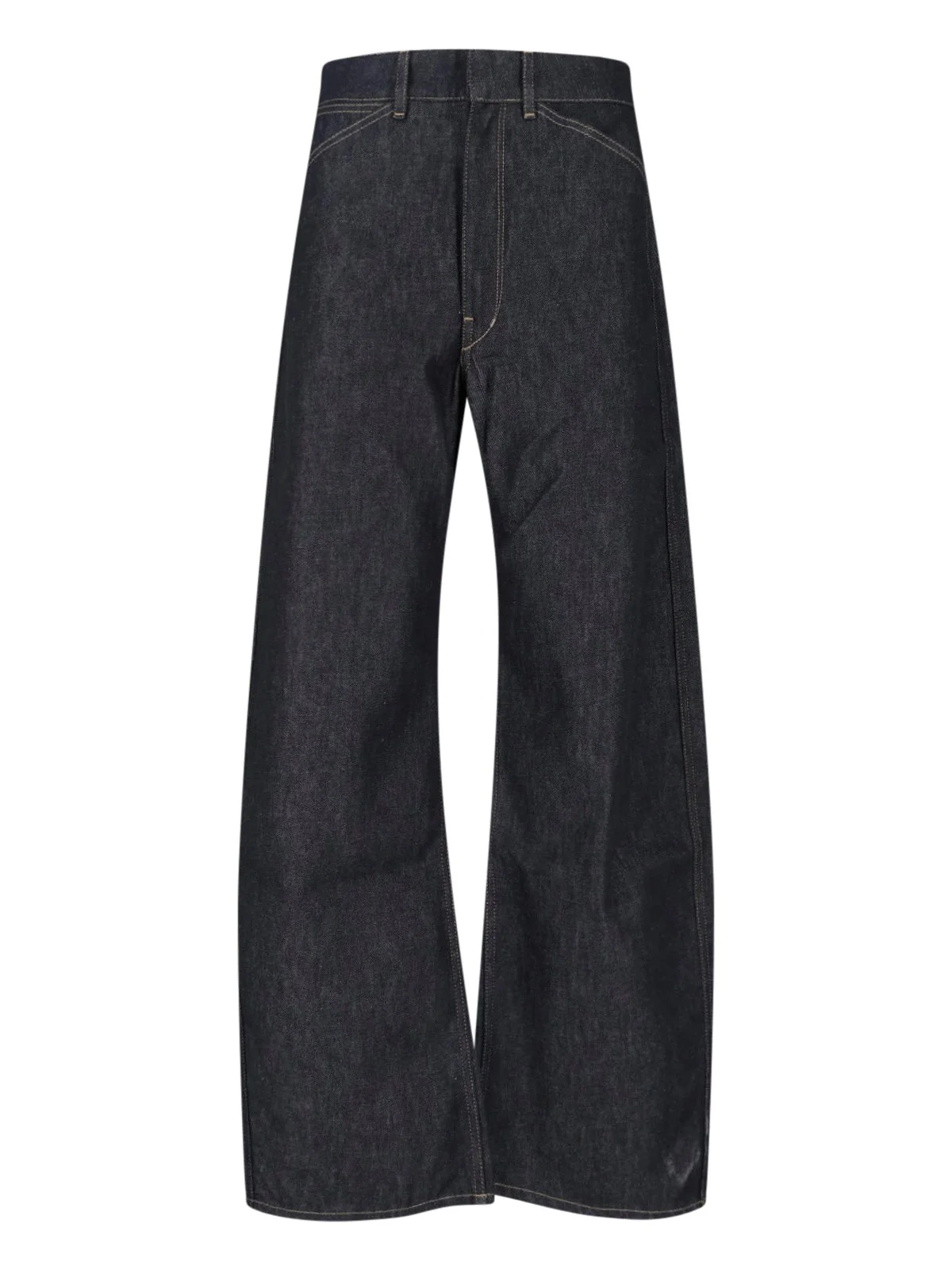 LEMAIRE ROUNDED JEANS IN BLUE COTTON DENIM WITH HIGH WAIST, ZIP AND HOOK CLOSURE, FIVE POCKETS, LOGO PATCH ON THE BACK, ROUNDED WIDE LEG. PRODUCT INFO PRODUCT CODE PA1264 LD1061BK965 COMPOSITION: 100% COTTON SIZE AND FIT: SOFT FIT MADE IN: ITALY
