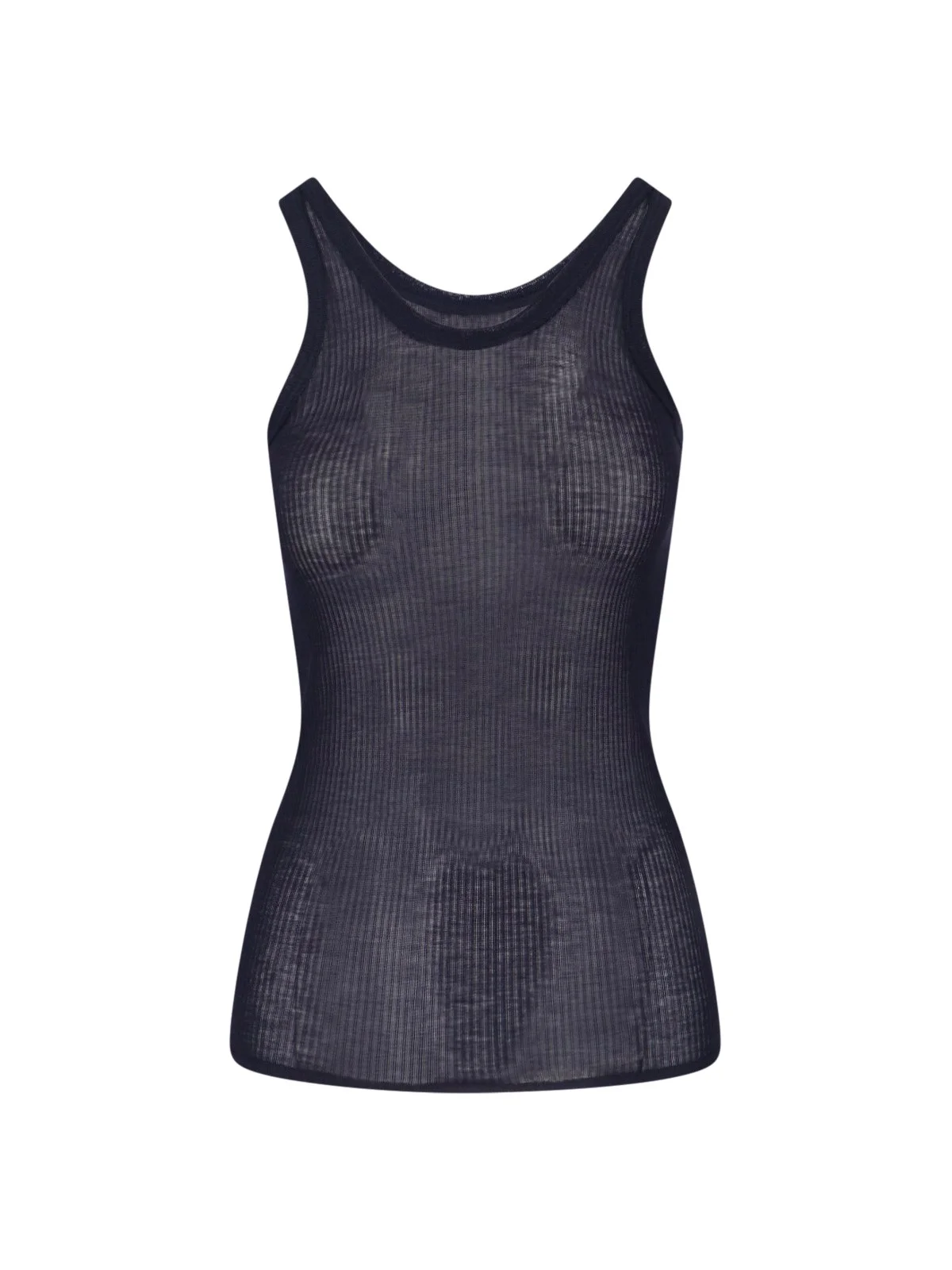 LEMAIRE SILK BLEND TOP, DARK BLUE, THIN STRAPS, RIBBED PATTERN, ROUND NECKLINE, STRAIGHT HEM. PRODUCT INFO PRODUCT CODE TS0026 LK1017BL980 COMPOSITION: 88% VISCOSE, 12% SILK SIZE AND FIT: SLIM FIT MADE IN: FRANCE