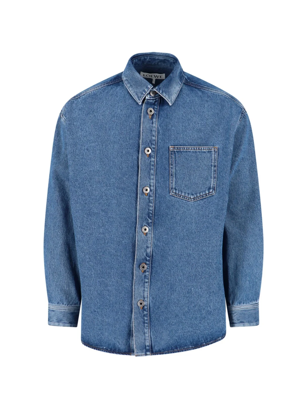 LOEWE 'ANAGRAM' BLUE COTTON DENIM SHIRT WITH CLASSIC COLLAR, LONG SLEEVES, BUTTON CLOSURE, FRONT POCKET, ANAGRAM LOGO ON THE BACK SLEEVE, BUTTON CUFFS, CURVED HEM. PRODUCT INFO PRODUCT CODE H526Y1DW275475 COMPOSITION: 96.6% COTTON, 3.4% POLYESTER SIZE AND FIT: REGULAR FIT MADE IN: ITALY
