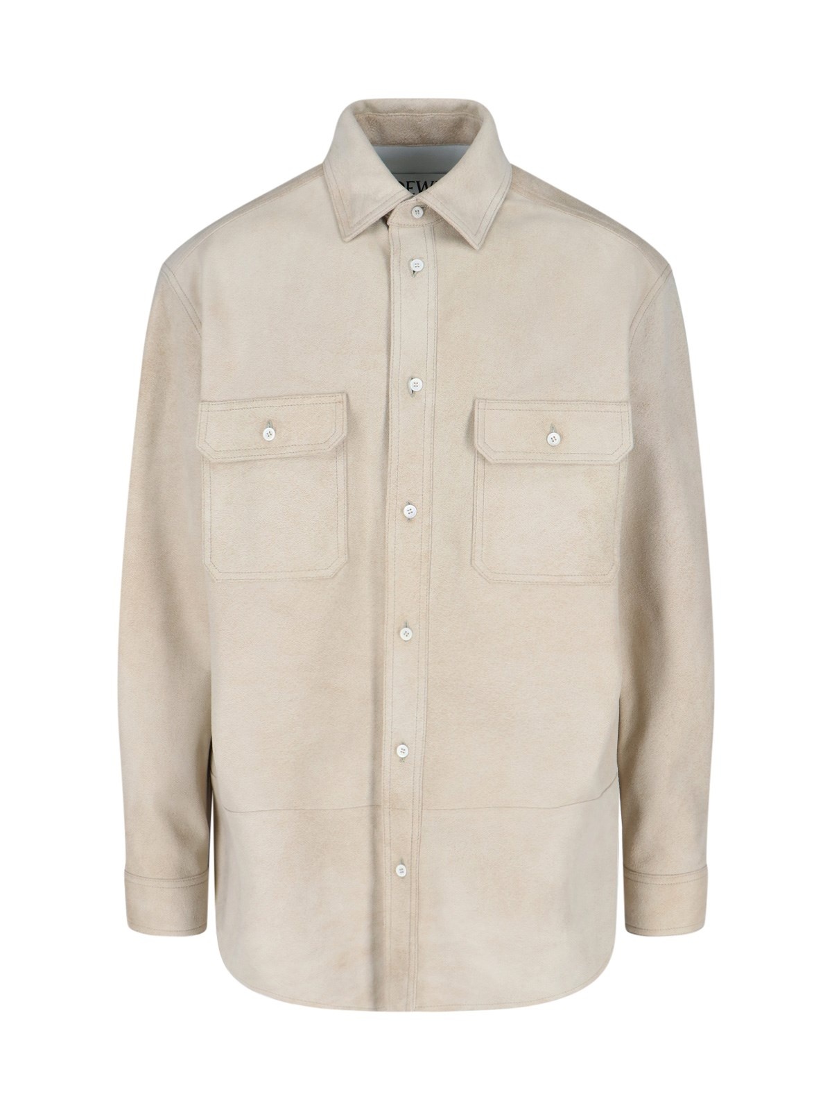 LOEWE 'ANAGRAM' SHIRT JACKET IN BEIGE SUEDE LAMBSKIN WITH CLASSIC COLLAR, BUTTON CLOSURE, TWO CHEST BUTTON FLAP POCKETS, BACK LOGO PATCH, BUTTON CUFFS, CURVED HEM. PRODUCT INFO PRODUCT CODE H526Y31L302100 COMPOSITION: 100% LAMBSKIN SIZE AND FIT: REGULAR FIT MADE IN: ITALY