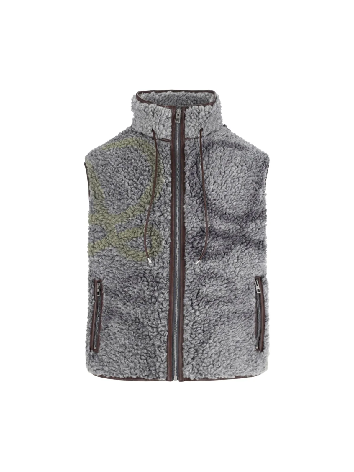 LOEWE 'ANAGRAM' GREY WOOL VEST WITH TEDDY KNIT, HIGH NECK WITH DRAWSTRING, ZIP CLOSURE, MULTICOLOR 'ANAGARAM' LOGO DETAIL ON THE FRONT AND BACK, TWO SIDE ZIP POCKETS, CONTRAST LEATHER DETAILS, STRAIGHT HEM. PRODUCT INFO PRODUCT CODE H526Y02X369990 COMPOSITION: 100% WOOL SIZE AND FIT: REGULAR FIT MADE IN: ITALY - TRIMS: 100% LEATHER