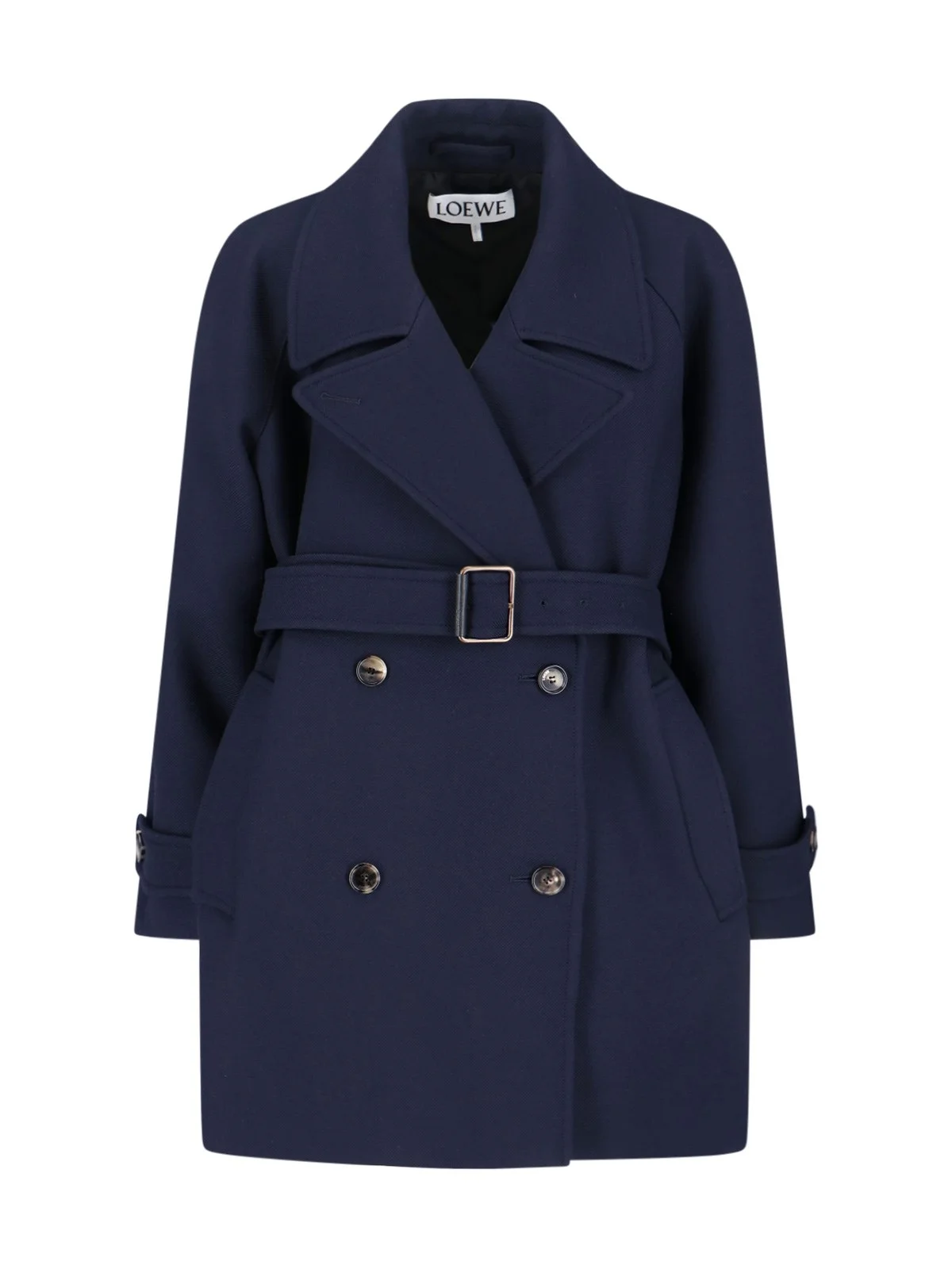 LOEWE DOUBLE-BREASTED WOOL COAT IN NAVY BLUE, CLASSIC LAPELS, FRONT BUTTON CLOSURE, BUTTONS ON THE CUFFS, REMOVABLE BELT, VERTICAL WELT POCKET ON THE FRONT, EMBOSSED INNER ANAGRAM LEATHER POCKET, SILK LINING, STRAIGHT HEM. PRODUCT INFO PRODUCT CODE S540Y01XBE5110 COMPOSITION: 100% WOOL SIZE AND FIT: SOFT FIT MADE IN: ITALY