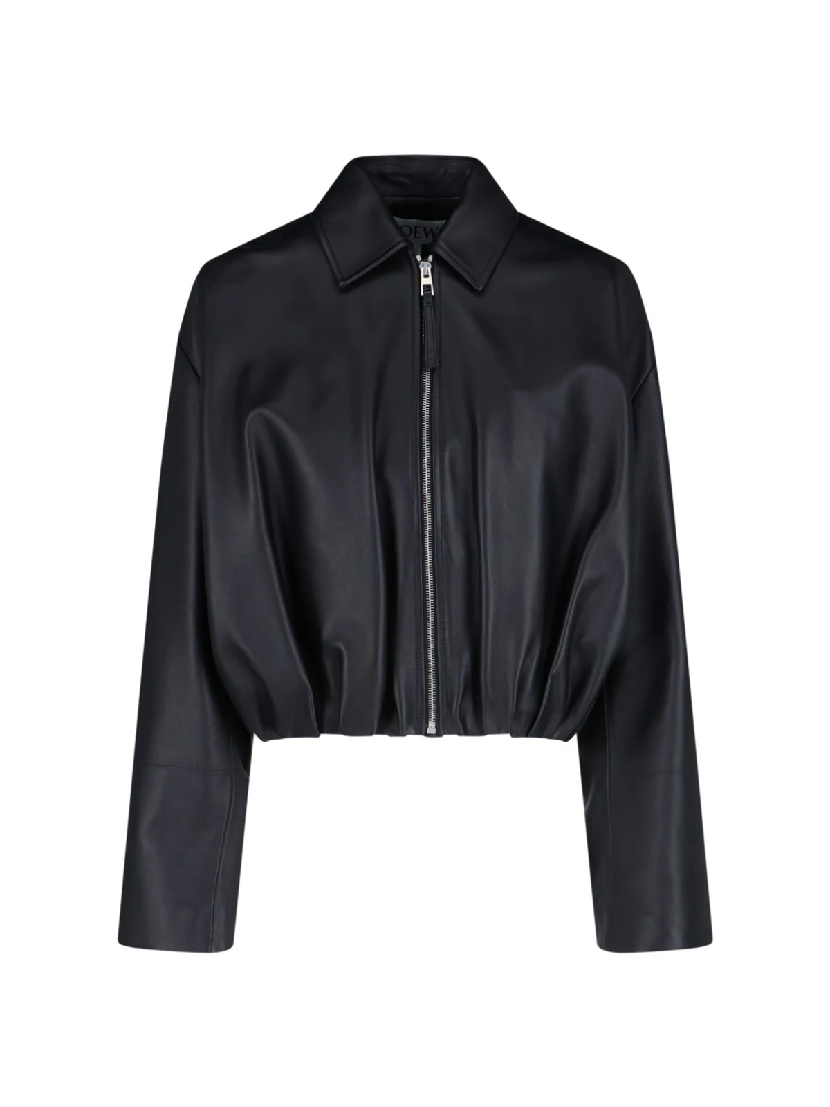 LOEWE DRAPED ZIP JACKET IN BLACK LAMB NAPPA LEATHER WITH CLASSIC COLLAR, ZIP CLOSURE, LEATHER KNOTTED ZIPPER DETAIL, TWO SIDE POCKETS, BACK LOGO PATCH, CURLED ASYMMETRICAL DRAPING DETAIL, STRAIGHT HEM. PRODUCT INFO PRODUCT CODE S540Y34L301100 COMPOSITION: 100% LAMBSKIN SIZE AND FIT: REGULAR FIT MADE IN: ITALY