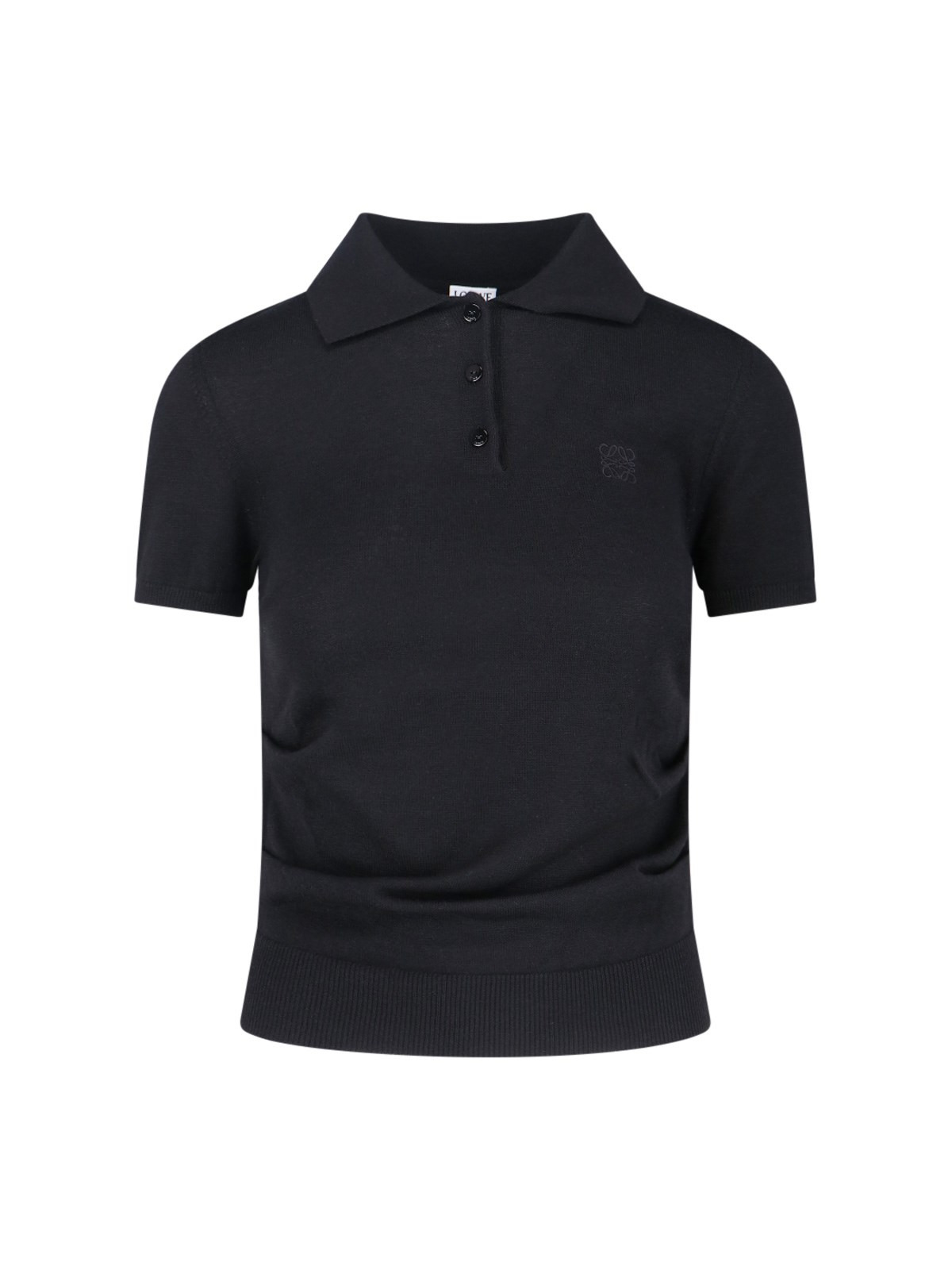 LOEWE LOGO POLO SHIRT IN BLACK CASHMERE WITH CLASSIC COLLAR, BUTTON CLOSURE, SHORT SLEEVES, TONE-ON-TONE EMBROIDERED LOGO, DRAPED EFFECT ON THE BOTTOM, AND STRAIGHT HEM. PRODUCT INFO PRODUCT CODE S359Y55K231100 COMPOSITION: 100% CASHMERE SIZE AND FIT: REGULAR FIT MADE IN: ITALY