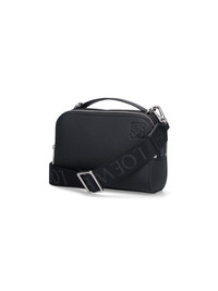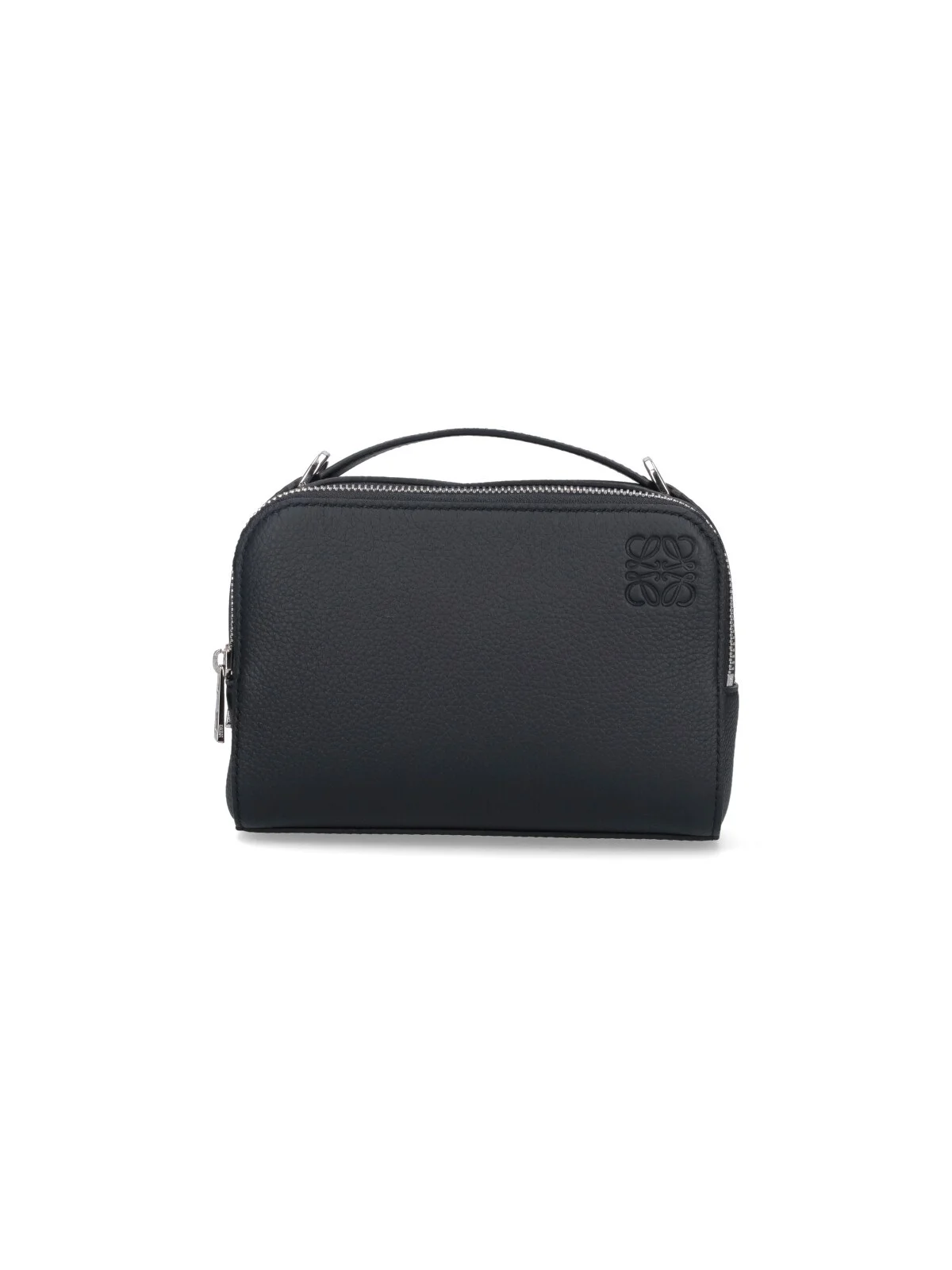 LOEWE MINI CAMERA BAG IN BLACK HAMMERED LEATHER WITH TOP HANDLE, EMBOSSED LOGO DETAIL, ADJUSTABLE AND REMOVABLE SHOULDER STRAP, JACQUARD LOGO PATTERN, MAXI FRONT ZIP POCKET, ENGRAVED ANAGRAM LOGO DETAIL, ZIP CLOSURE, INNER FLAT POCKET, MAIN INNER COMPARTMENT. PRODUCT INFO PRODUCT CODE C660R41X011100 COMPOSITION: 100% CALF LEATHER SIZE AND FIT: H 13 X W 18 X D 8.5 CM MADE IN: SPAIN - STRAP SPAN: 37-63 CM