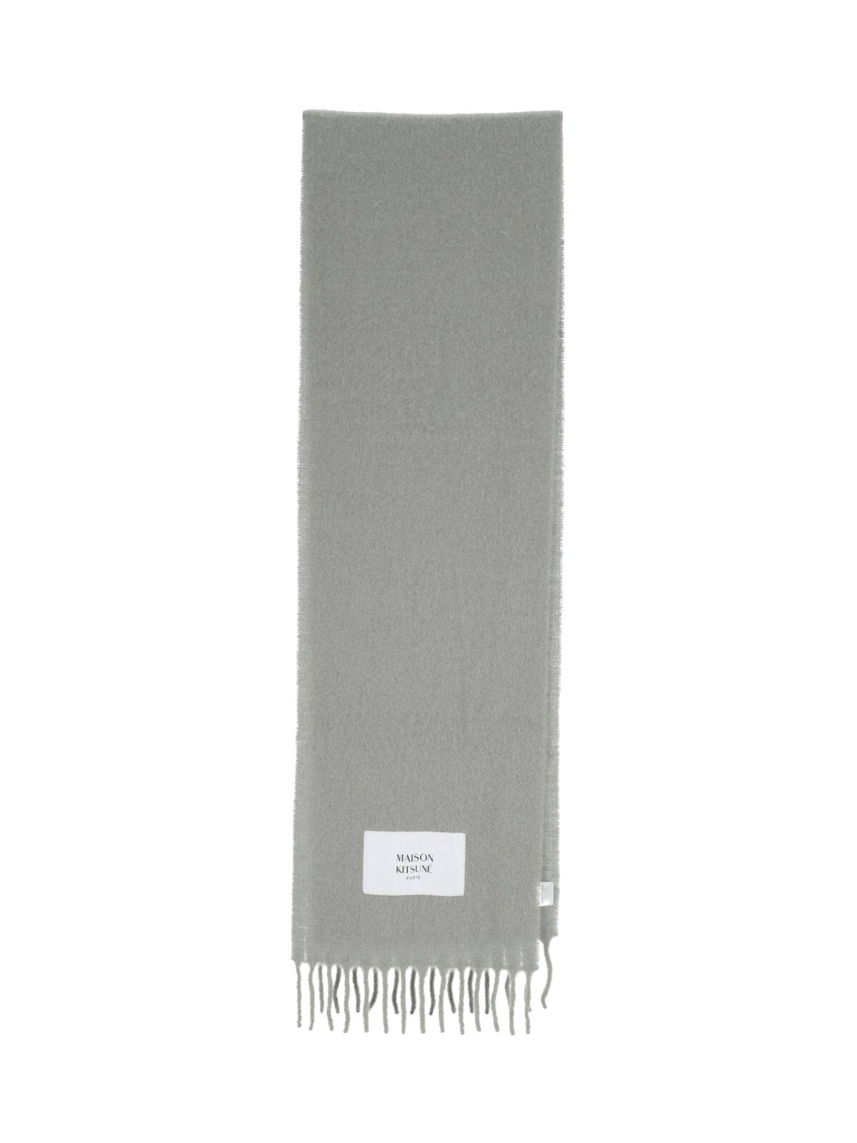 MAISON KITSUNE ALPACA BLEND SCARF IN GREEN, RECTANGULAR DESIGN, EMBROIDERED LOGO LABEL ON THE FRONT, FRINGED HEM. PRODUCT INFO PRODUCT CODE LM06206WA0022P131 COMPOSITION: 80% ALPACA WOOL, 20% POLYAMIDE SIZE AND FIT: H 250 X W 36 CM MADE IN: ITALY