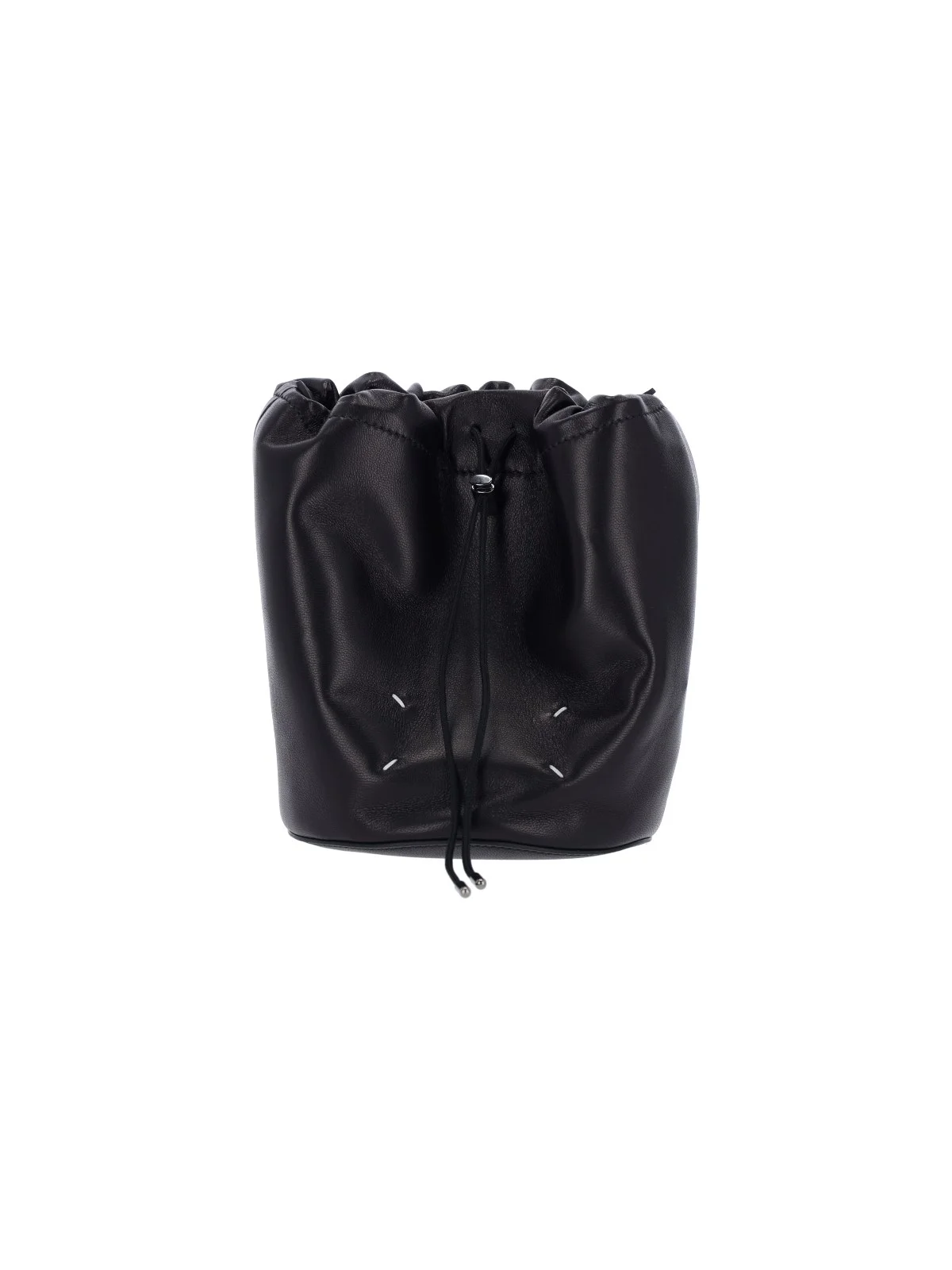 MAISON MARGIELA BLACK LAMBSKIN 5AC BUCKET BAG WITH ADJUSTABLE DRAWSTRING CLOSURE, ADJUSTABLE TOP SHOULDER STRAP, CONTRAST "FOUR STITCHES" LOGO STITCHING DETAIL AT THE FRONT, INNER NUMERIC LOGO LABEL, SINGLE MAIN INNER COMPARTMENT. PRODUCT INFO PRODUCT CODE SB2ZH0003 P8832HB323 COMPOSITION: 100% LAMBSKIN SIZE AND FIT: H 23 X W 15 X D 12 CM MADE IN: ITALY