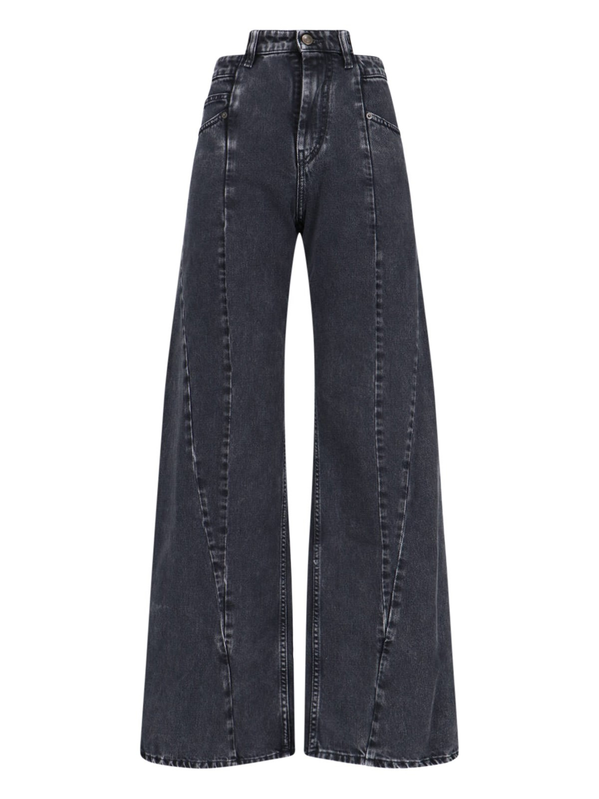 MAISON MARGIELA "DECORTIQUE" PALAZZO JEANS IN BLACK DENIM WITH A DISTRESSED WASH, ASYMMETRIC HIGH WAIST, BELT LOOPS, BUTTON AND ZIP CLOSURE, FIVE POCKETS DESIGN, ASYMMETRICAL STITCHING ON THE FRONT AND BACK, CONTRAST "FOUR STITCHES" STITCHING AT THE BACK, WIDE LEG. PRODUCT INFO PRODUCT CODE S51LA0133 S30496961 COMPOSITION: 100% COTTON SIZE AND FIT: REGULAR FIT MADE IN: ITALY