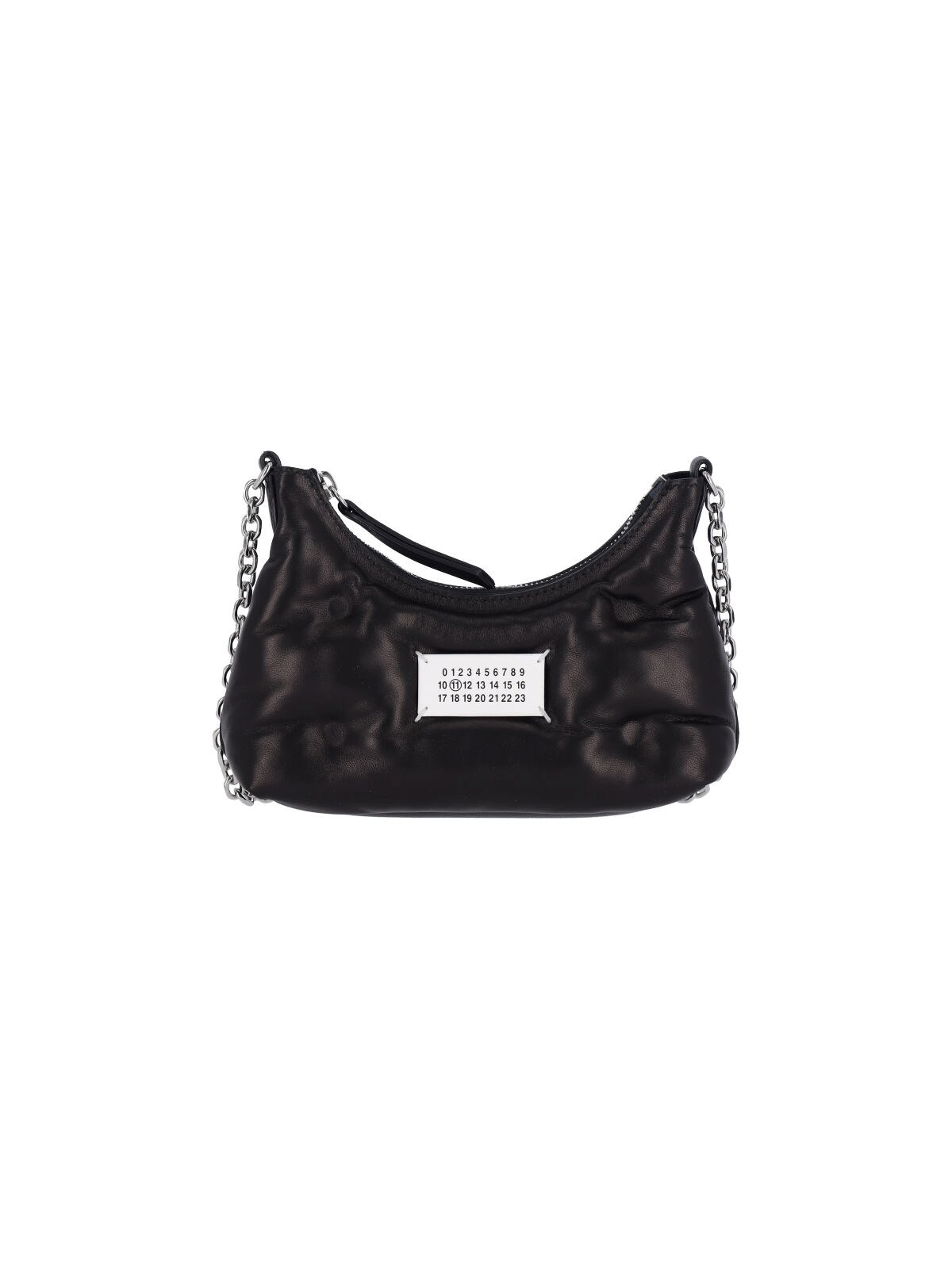 MAISON MARGIELA MICRO "GLAM SLAM HOBO" BAG IN BLACK QUILTED NAPPA LEATHER, SILVER METAL DETAILS, ADJUSTABLE AND REMOVABLE CHAIN SHOULDER STRAP, CONTRAST NUMERIC LOGO LABEL ON THE FRONT, ZIP CLOSURE WITH KNOTTED ZIPPER PULL, MAIN INNER COMPARTMENT, INNER ZIP POCKET. PRODUCT INFO PRODUCT CODE SB1WG0021 P4300T8013 COMPOSITION: 100% LEATHER SIZE AND FIT: H 14 X W 19 X D 6 CM MADE IN: ITALY - TRIMS: 100% METAL - STRAP SPAN: 31-39 CM