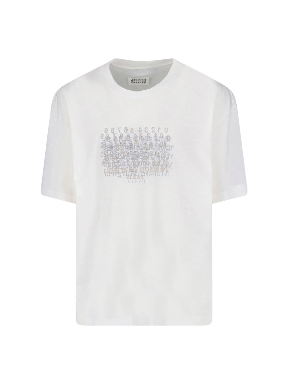 MAISON MARGIELA 'NUMERIC' WHITE COTTON CREW NECK T-SHIRT WITH SHORT SLEEVES, CONTRAST 'NUMERIC' LOGO PRINTED AND EMBROIDERED AT THE FRONT, RIBBED TRIMS, STRAIGHT HEM. PRODUCT INFO PRODUCT CODE S50GC0732 M20164971 COMPOSITION: 100% COTTON SIZE AND FIT: REGULAR FIT MADE IN: ITALY