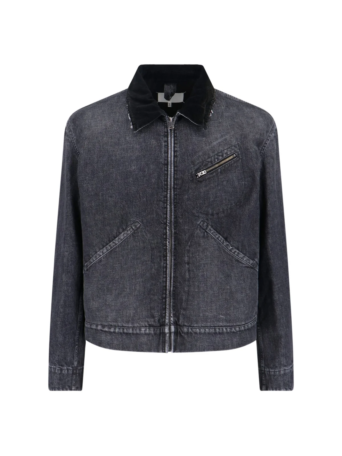 MAISON MARGIELA ZIP JACKET IN BLACK COTTON DENIM WITH CLASSIC COLLAR, FRONT CLOSURE, LONG SLEEVES, FRONT ZIP POCKET, TWO WELT POCKETS ON THE FRONT, FOUR STITCHES DETAIL EMBROIDERED AT THE BACK, STRAIGHT HEM. PRODUCT INFO PRODUCT CODE S67AM0107 M30036962 COMPOSITION: 100% COTTON SIZE AND FIT: REGULAR FIT MADE IN: ITALY