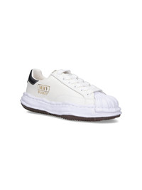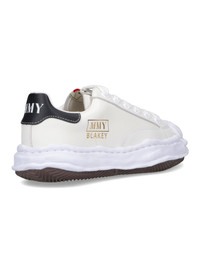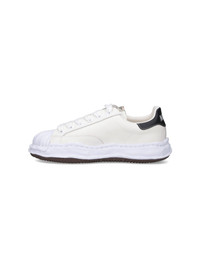 MAISON MIHARA YASUHIRO BLAKEY SNEAKERS IN WHITE LEATHER WITH ROUND RUBBER TOE, LACES, LOGO LABEL ON THE TONGUE, GOLD LOGO PRINT ON THE SIDE, BLACK BACK TAB WITH CONTRASTING LOGO DETAIL, AND OVERSIZED RUBBER SOLE. PRODUCT INFO PRODUCT CODE A06FW702WHITE COMPOSITION: 100% LEATHER MADE IN: CINA - SOLE: 100% RUBBER