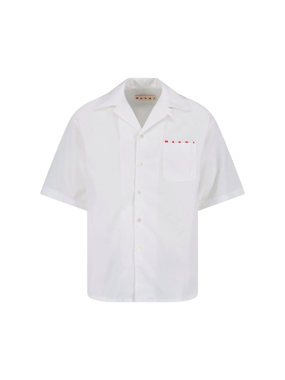 MARNI BOWLING SHIRT IN WHITE COTTON WITH CUBAN COLLAR, SHORT SLEEVES, BUTTON CLOSURE, FRONT POCKET, CONTRASTING LOGO PRINT ON THE FRONT, AND STRAIGHT HEM. PRODUCT INFO PRODUCT CODE CUMU0213PP USCT88LRW01 COMPOSITION: 100% COTTON SIZE AND FIT: REGULAR FIT MADE IN: ROMANIA