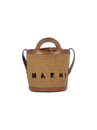 MARNI BUCKET BAG 'TROPICALIA', MADE OF RAFFIA AND BROWN LEATHER, SHOULDER STRAP, TWO TOP HANDLES, BLACK LOGO EMBROIDERY ON FRONT, DRAWSTRING CLOSURE, ONE MAIN INSIDE COMPARTMENT. PRODUCT INFO PRODUCT CODE SCMP0056Q1 P386000M50 - 52% COTTON, 48% POLYAMIDE - DETAILS: 100% LEATHER - H 17 X W 18 X D 18 CM MADE IN: ITALY
