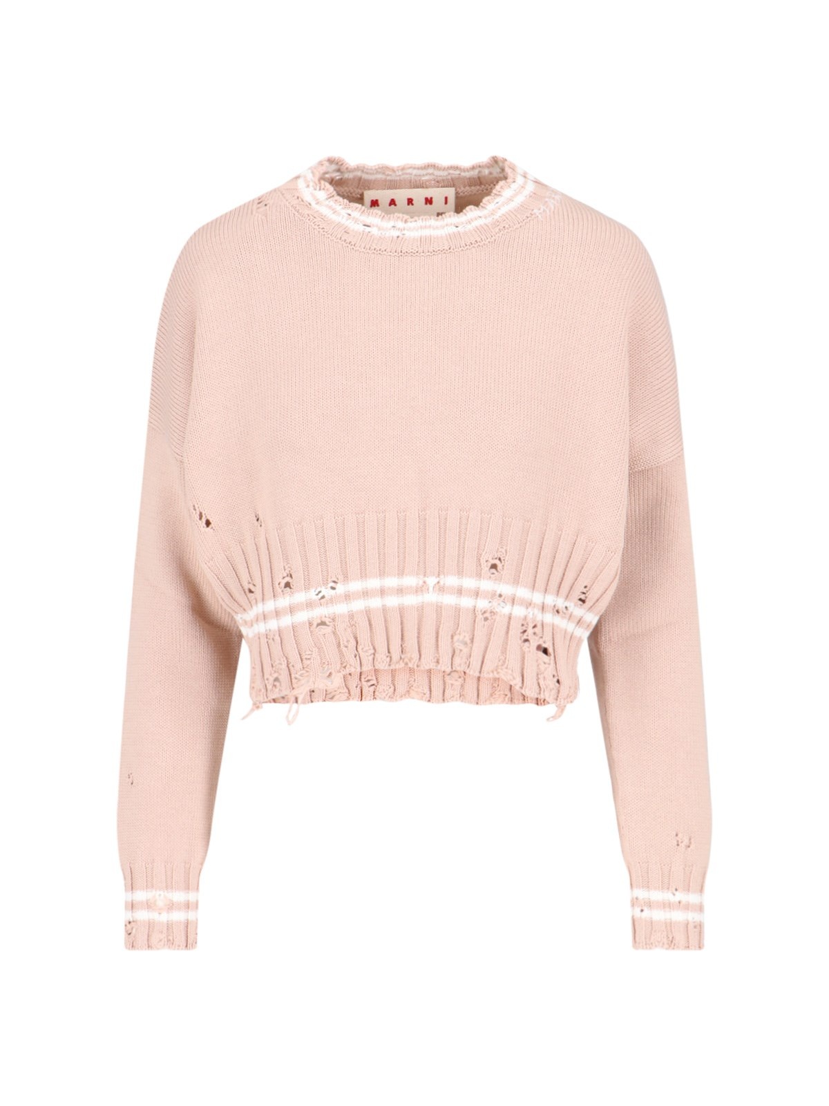 MARNI CROP CREW NECK SWEATER IN PINK COTTON WITH WHITE STRIPE INTARSIA PATTERN, ALL-OVER DESTROYED DETAILS, CREW NECK, WHITE LOGO EMBROIDERY DETAIL, RIBBED TRIMS, RAW CUT HEM. PRODUCT INFO PRODUCT CODE GCMD0276Q2 UFC65200W35 COMPOSITION: 100% COTTON SIZE AND FIT: BOXY FIT MADE IN: ITALY