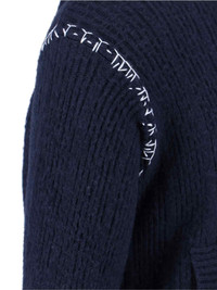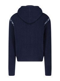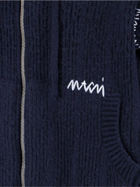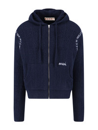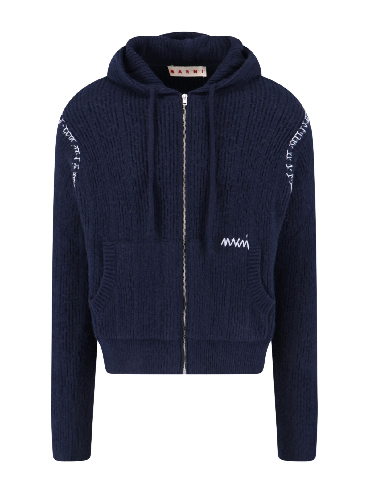 MARNI KNITTED SWEATER IN NAVY BLUE WOOL AND CASHMERE BLEND, KNITTED, DRAWSTRING HOOD, ZIP CLOSURES, CONTRAST STITCHING DESIGN, SIDE LOGO, TWO SIDE POCKETS, RIBBED TRIM, AND STRAIGHT HEM. PRODUCT INFO PRODUCT CODE CDMG0171A0 UFZ35100B90 COMPOSITION: 90% WOOL, 10% CASHMERE SIZE AND FIT: REGULAR FIT MADE IN: ROMANIA