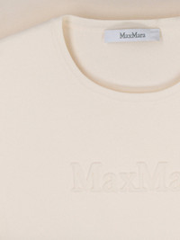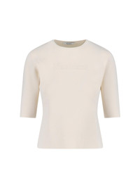 MAX MARA 'ADELIO' CREAM VISCOSE BLEND CREW NECK T-SHIRT WITH THREE-QUARTER SLEEVES, TONE-ON-TONE EMBOSSED LOGO ON THE FRONT, STRAIGHT HEM. PRODUCT INFO PRODUCT CODE 2611361098600001 COMPOSITION: 65% VISCOSE, 35% POLYAMIDE SIZE AND FIT: REGULAR FIT MADE IN: CHINA
