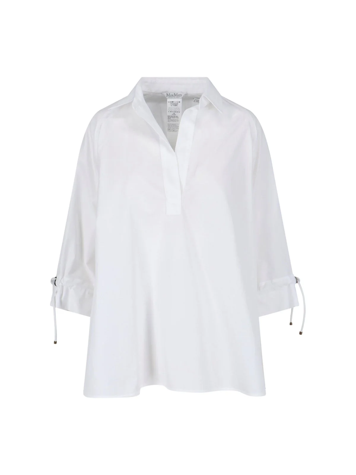 MAX MARA 'ADORNI' WHITE COTTON SHIRT WITH COLLAR, V-NECK, THREE-QUARTER SLEEVES, SIDE TIES. PRODUCT INFO PRODUCT CODE 2611191062600001 COMPOSITION: 100% COTTON SIZE AND FIT: REGULAR FIT MADE IN: ITALY