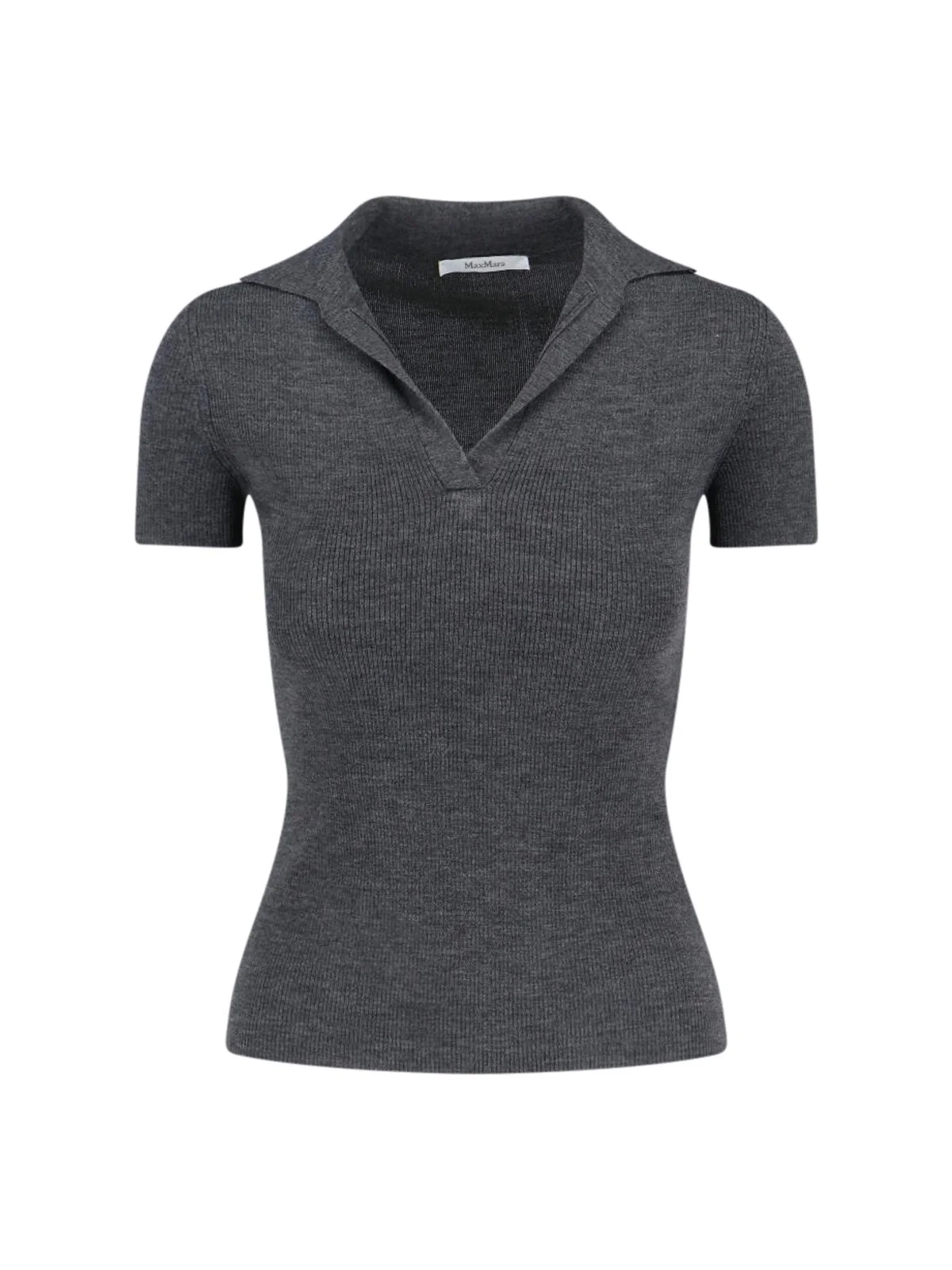 MAX MARA 'ALBERO' GREY VIRGIN WOOL POLO SHIRT WITH RIBBED PATTERN, V-NECK, COLLAR, SHORT SLEEVES, STRAIGHT HEM. PRODUCT INFO PRODUCT CODE 2611361171600008 COMPOSITION: 100% VIRGIN WOOL SIZE AND FIT: REGULAR FIT MADE IN: ROMANIA