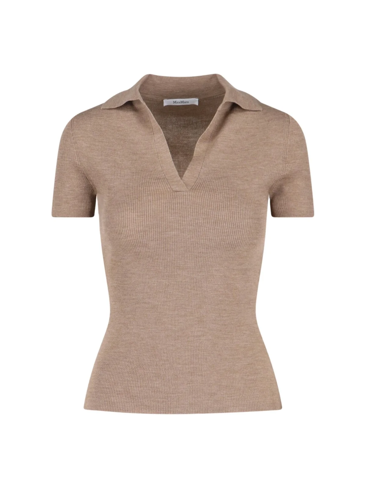 MAX MARA 'ALBERO' BEIGE VIRGIN WOOL POLO SHIRT WITH RIBBED KNIT, V-NECK, COLLAR, SHORT SLEEVES, STRAIGHT HEM. PRODUCT INFO PRODUCT CODE 2611361171600009 COMPOSITION: 100% VIRGIN WOOL SIZE AND FIT: REGULAR FIT MADE IN: ROMANIA