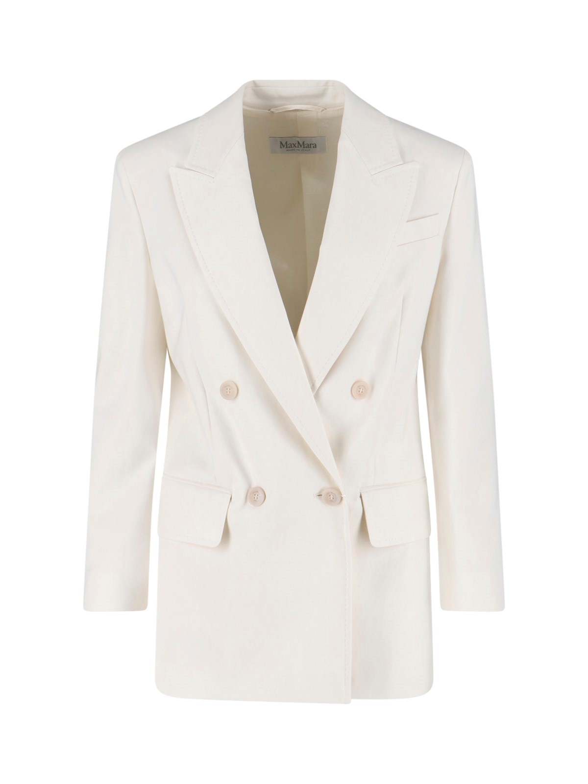 MAX MARA 'OLIMPIA' DOUBLE-BREASTED BLAZER IN WHITE COTTON WITH PEAK LAPELS, BUTTON CLOSURE, TWO SIDE FLAP POCKETS, CHEST POCKET, BUTTON CUFFS, STRAIGHT HEM. PRODUCT INFO PRODUCT CODE 2521046071600005 COMPOSITION: 95% COTTON, 5% ELASTANE SIZE AND FIT: REGULAR FIT MADE IN: ITALY
