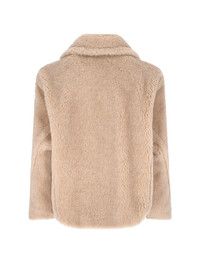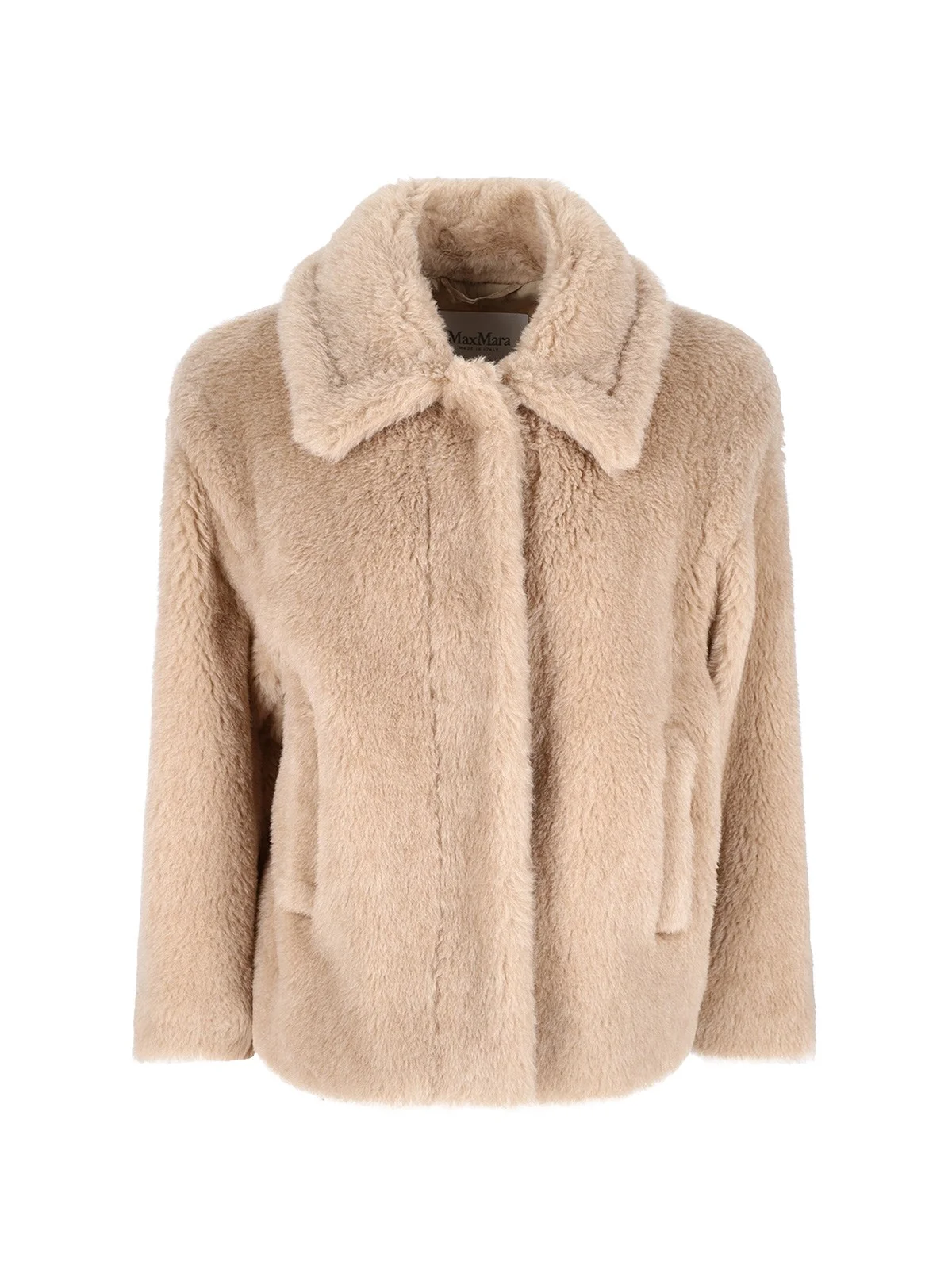 MAX MARA 'TEDDY BEAR' CROP COAT IN BEIGE ALPACA AND VIRGIN WOOL BLEND WITH ALL-OVER TEDDY WORKMANSHIP, CLASSIC COLLAR, LONG SLEEVES, DROPPED SHOULDERS, BUTTON CLOSURE, TWO SIDE WELT POCKETS, STRAIGHT HEM. PRODUCT INFO PRODUCT CODE 2611081011600029 COMPOSITION: 62% ALPACA, 26% VIRGIN WOOL, 12% SILK SIZE AND FIT: CROPPED FIT MADE IN: ITALY - BUTTONS: 100% HORN