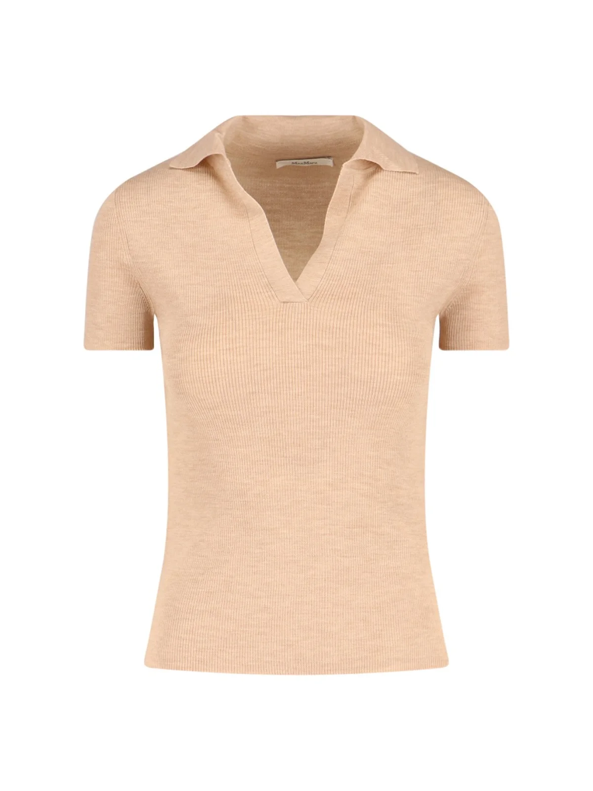 MAX MARA BEIGE RIBBED VIRGIN WOOL POLO SHIRT WITH CLASSIC COLLAR, V-NECK, SHORT SLEEVES, STRAIGHT HEM. PRODUCT INFO PRODUCT CODE 2611361171600010 COMPOSITION: 100% VIRGIN WOOL SIZE AND FIT: SLIM FIT MADE IN: ROMANIA
