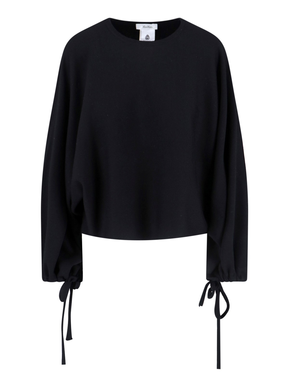 MAX MARA 'FRAIS' BLACK VIRGIN WOOL CREW NECK SWEATER WITH BACK LOGO LABEL, ADJUSTABLE LACES ON THE CUFFS, STRAIGHT HEM. PRODUCT INFO PRODUCT CODE 2521366101600002 COMPOSITION: 100% VIRGIN WOOL SIZE AND FIT: SOFT FIT MADE IN: CHINA