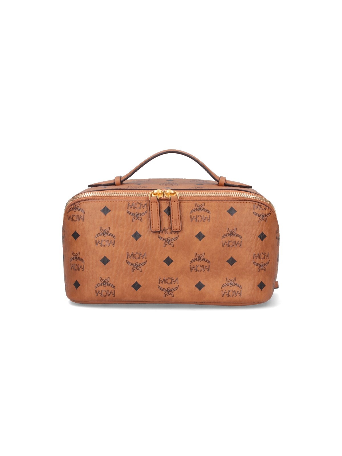 MCM OTTOMAR TOILETRY POUCH IN BROWN "VISETOS" WITH LEATHER TRIM, LOGO PRINT PATTERN, HANDLE, DOUBLE ZIP CLOSURE, CENTRAL INNER ZIP POCKET, TWO SEPARATE INNER COMPARTMENTS. PRODUCT INFO PRODUCT CODE MXZFATT06CO COMPOSITION: 63% POLYURETHANE, 20% POLYESTER, 17% COTTON SIZE AND FIT: H 10.5 X W 20 X D 9.5 CM MADE IN: SOUTH KOREA - TRIMS: 100% LEATHER - HANDLE DROP: 4 CM