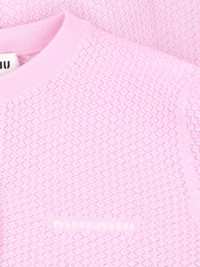 MIU MIU PINK CASHMERE CARDIGAN WITH LACE EFFECT, CREW NECK, BUTTON CLOSURE, WHITE LOGO INTARSIA ON THE CHEST, RIBBED TRIMS, STRAIGHT HEM. PRODUCT INFO PRODUCT CODE MMF971 OOO 17NNF0E18 COMPOSITION: 100% CASHMERE SIZE AND FIT: REGULAR FIT MADE IN: ITALY